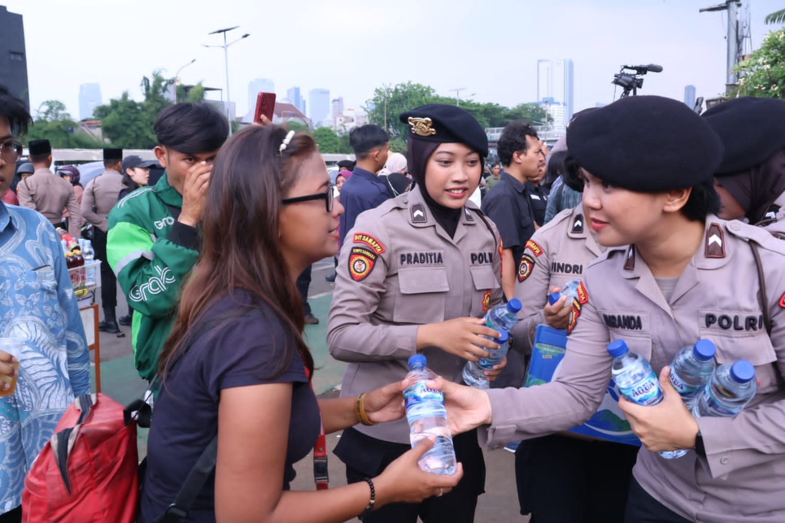 Jakarta – Polda Metro Jaya kembali menunjukkan aksi humanis dalam pengamanan aksi demi di depan gedung DPR RI. Selain mengamankan jalannya aksi, para polwan membagikan air mineral dan roti, serta memberikan pelayanan medis bagi para pengunjuk rasa yang membutuhkan.