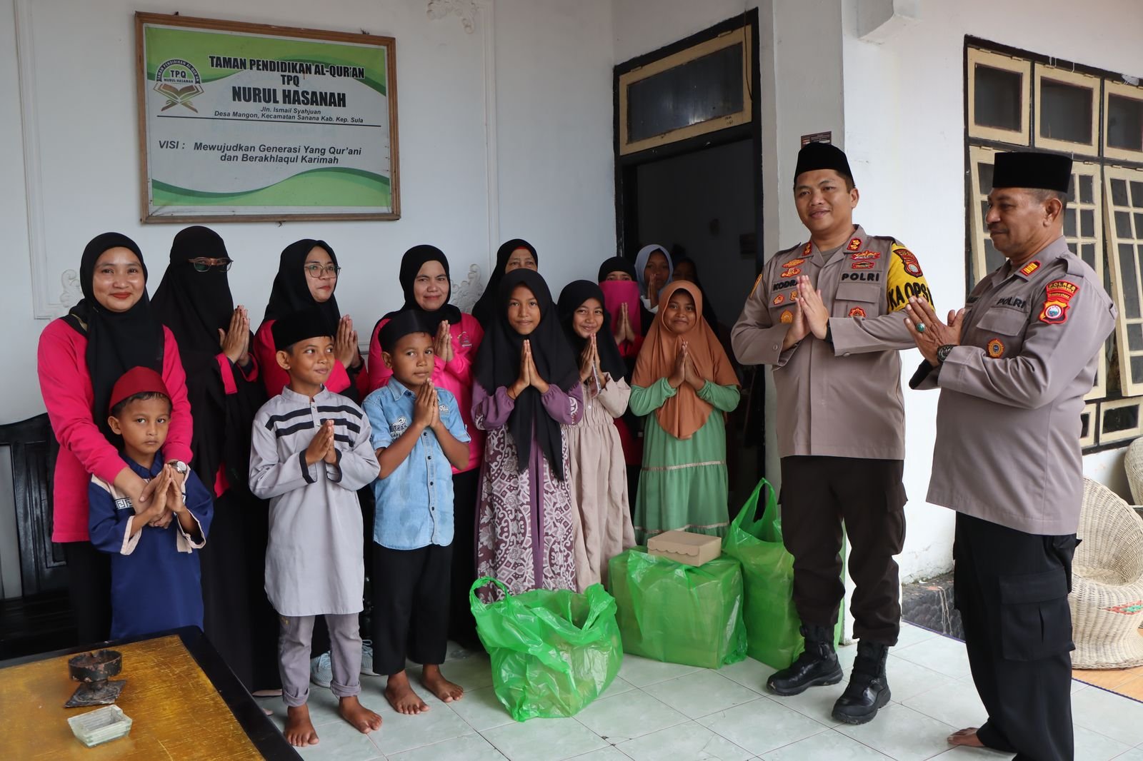 Suasana penuh kehangatan dan keceriaan terlihat saat para anak panti asuhan menyambut kehadiran polisi dengan senyum mereka.