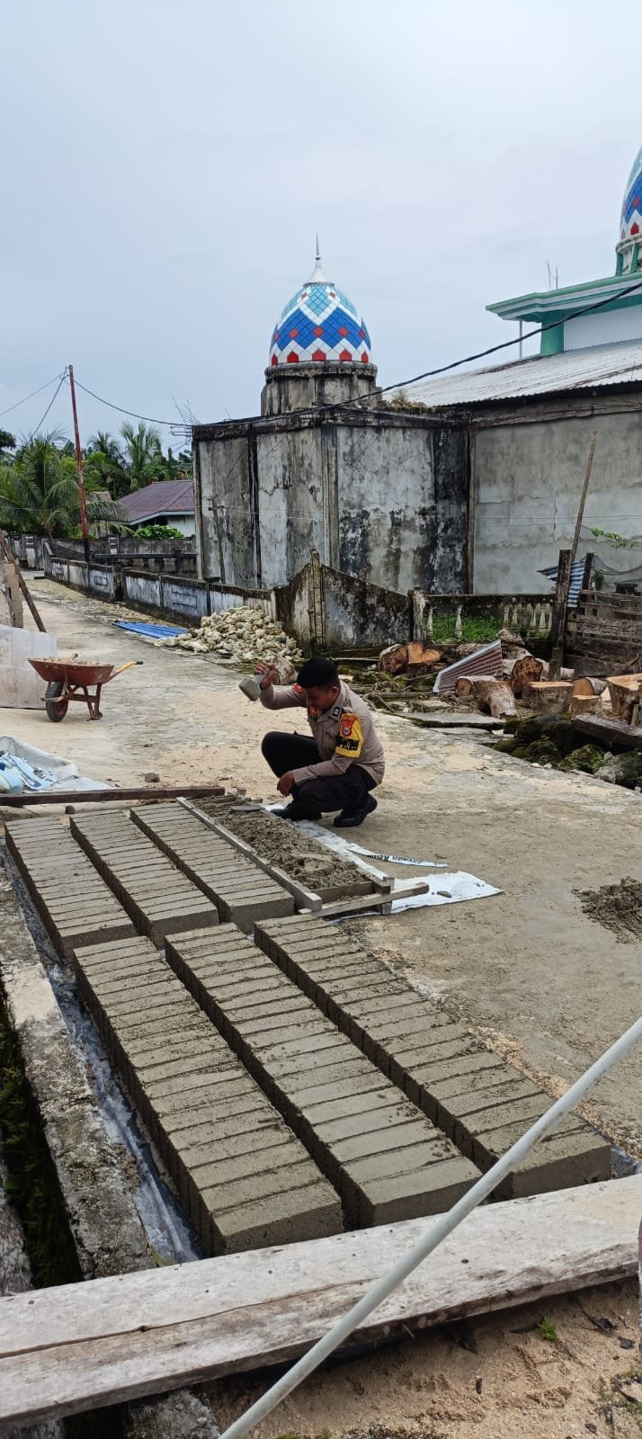 Humas Polri – Bhabinkamtibmas Polsek Taliabu Timur Selatan, Briptu M. Amin, turut membantu warga Desa Parigi dalam pembuatan batu bata yang digunakan untuk pembangunan Masjid Al Muhajirin, Desa Parigi, Kecamatan Taliabu Timur.