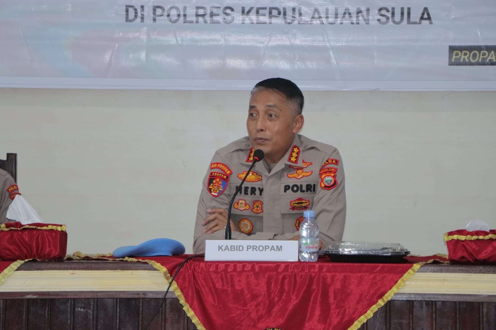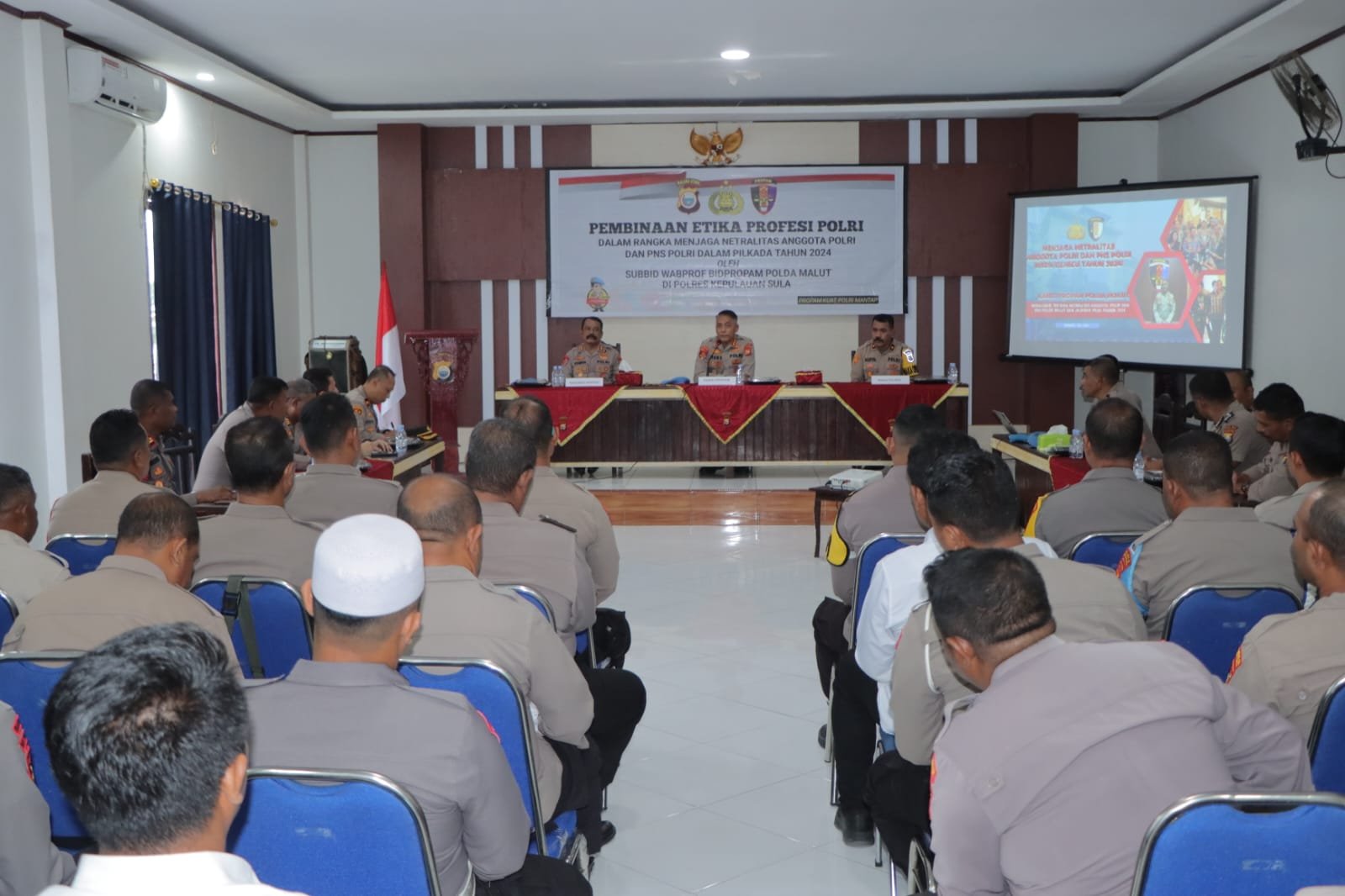 Polres Kepulauan Sula- Bidang Profesi dan Keamanan (Bidpropam) Polda Malut Melaksanakan kegiatan Pembinaan Etika Profesi Polri dalam rangka menjaga netralitas Anggota Polri dan PNS Polri dalam rangka Pilkada Tahun 2024, yang dilaksanakan di Aula Polres Sula, Senin (29/7/24).