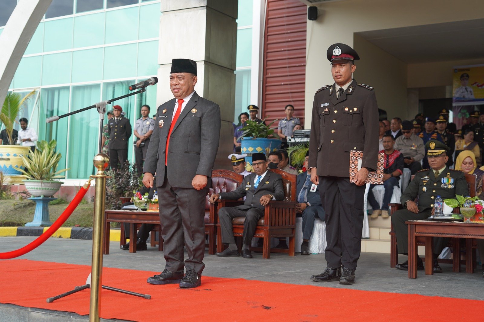 Tampak Hadir Wakil Bupati Halmahera Utara Dr. Kasman Hi. Ahmad,M.Si, Kapolres Halut AKBP Faidil Zikri S.H S.I.K, M.Si, Ketua DPRD Kabupaten Halmahera Utara Ibu Christina Lesnussa, Dandim 1508/Tobelo Letkol Inf. Alex Donal Maritua Lumban Gaol,S.E,M.M, Kepala Kejaksaan Negeri Tobelo Bpk. Ahsan Thamrin,S.H,M.H, Kepala Pengadilan Negeri Tobelo R. Muhamad Syakrani, S.H, Sekretaris Daerah Kab. Halmahera Utara Bpk. E.J Papilaya, Dankipan C Yonif 732/Banau Lettu Inf. Hendry Yanwar, Danki Kompi 1 Batalyon A Pelopor Iptu Moch Thilio Bintang Onasis S.Tr.K dan seluruh Pimpinan OPD Halut.