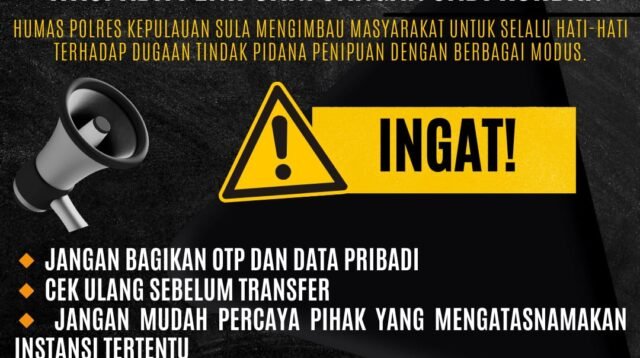 HUMAS POLRES SULA — Polres Kepulauan Sula mengimbau masyarakat untuk meningkatkan kewaspadaan terhadap maraknya penipuan selengkapnya