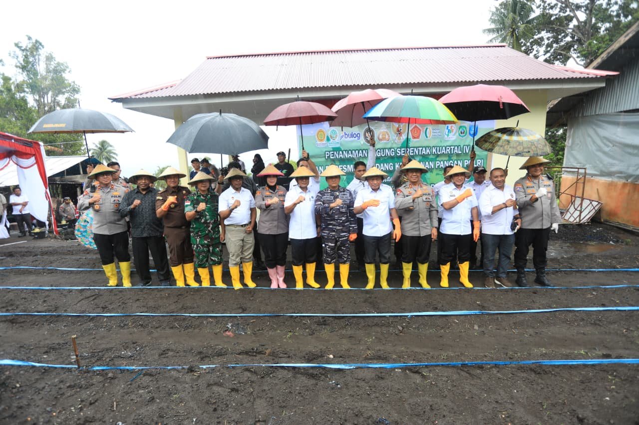 Sementara itu, di Maluku Utara, kegiatan diisi dengan penyerahan bantuan sembako kepada kelompok tani, penanaman jagung secara simbolis oleh Kapolda dan Wakil Gubernur Maluku Utara, serta pelepasan hasil panen ke Perum Bulog.