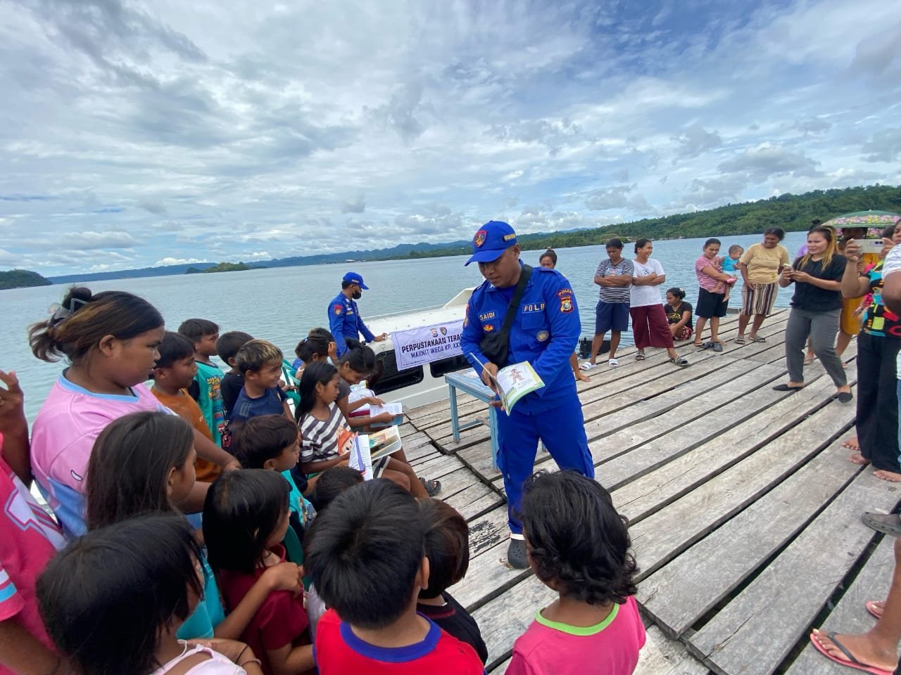 Direktorat Kepolisian Perairan dan Udara (Polairud) Polda Maluku Utara melalui Unit Weda KP.XXX-1011 melaksanakan kegiatan Perpustakaan Terapung di Desa Sidanga, Kecamatan Weda, Kabupaten Halmahera Tengah.