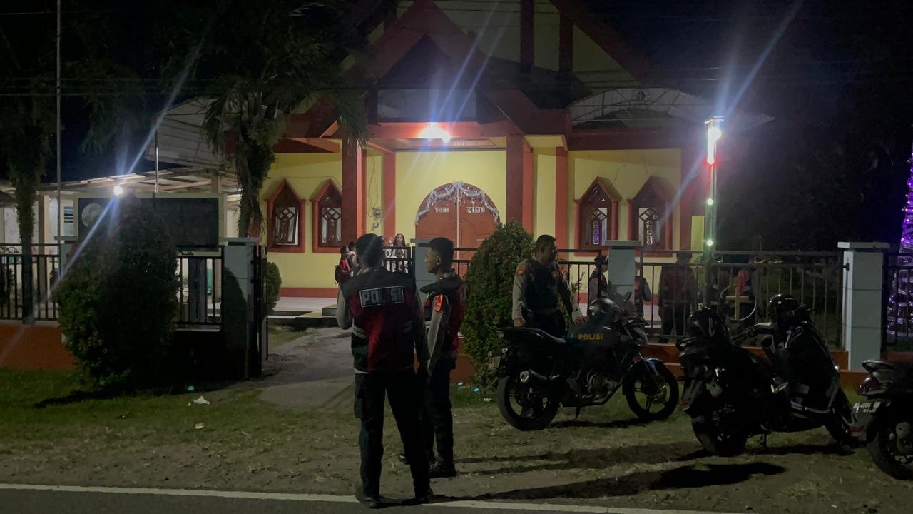 Dalam rangka menjamin keamanan dan kenyamanan umat Kristiani menjelang pelaksanaan ibadah Natal, personel Subsatgas Samapta Operasi Lilin Kie Raha 2025 Polda Maluku Utara melaksanakan kegiatan sterilisasi di Gereja Masehi Injili yang berlokasi di kawasan Bukit Durian, pada Senin malam (22/12).