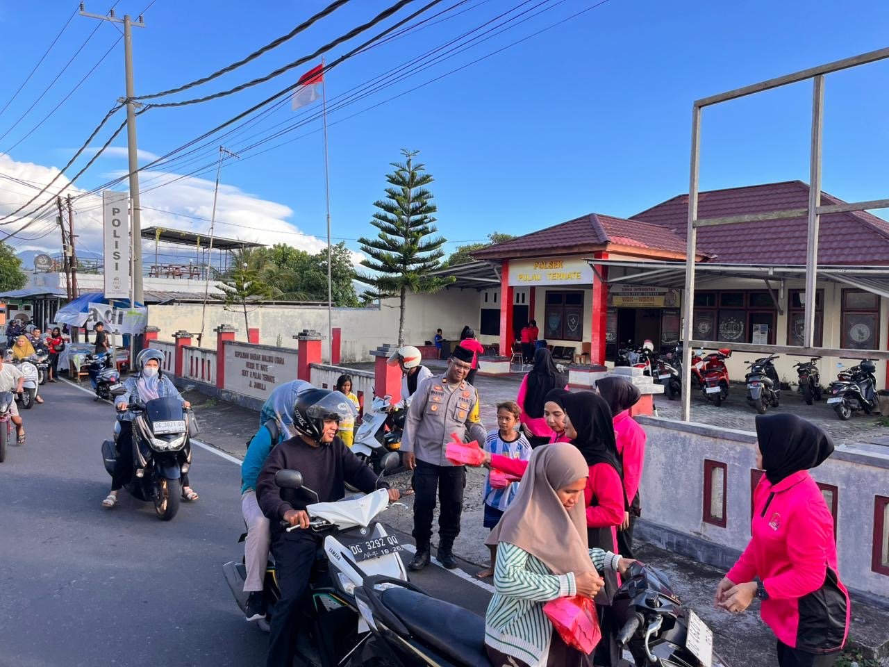 Menjelang waktu berbuka puasa, suasana di depan Mapolsek Pulau Ternate, Kelurahan Jambula, Kecamatan Pulau Ternate, Senin (3/3) kemarin, mendadak berubah menjadi lebih hangat dan penuh keakraban. Personel Kepolisian Sektor (Polsek) Pulau Ternate bersama Ibu Bhayangkari Ranting setempat menggelar aksi sosial dengan membagikan puluhan paket takjil kepada para pengendara roda dua maupun roda empat yang melintas.