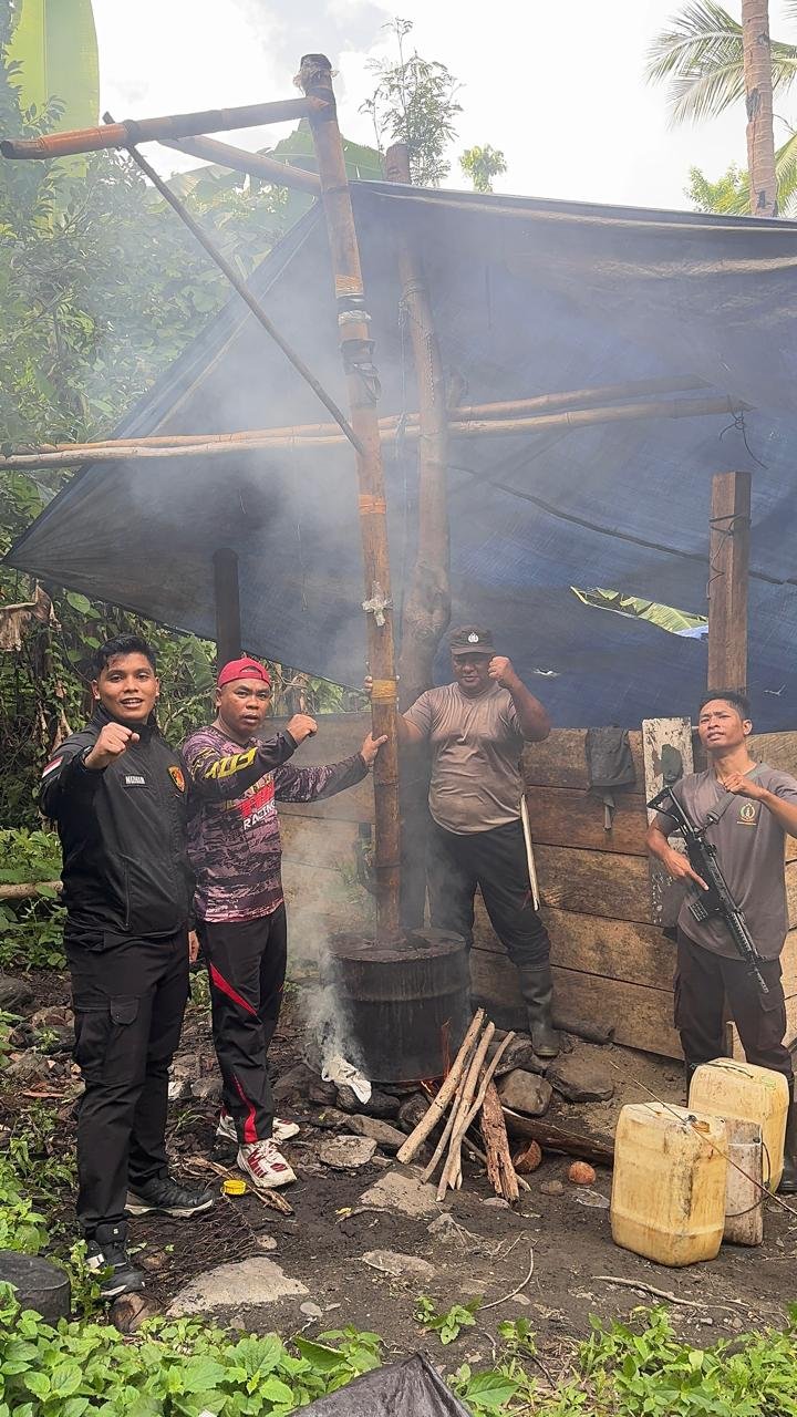 Dalam pelaksanaan kegiatan tersebut, petugas melakukan penyisiran di lokasi yang diduga sebagai tempat pembuatan minuman keras tradisional, cap tikus, di area perkebunan desa Sawadai, Kec. Bacan Selatan.