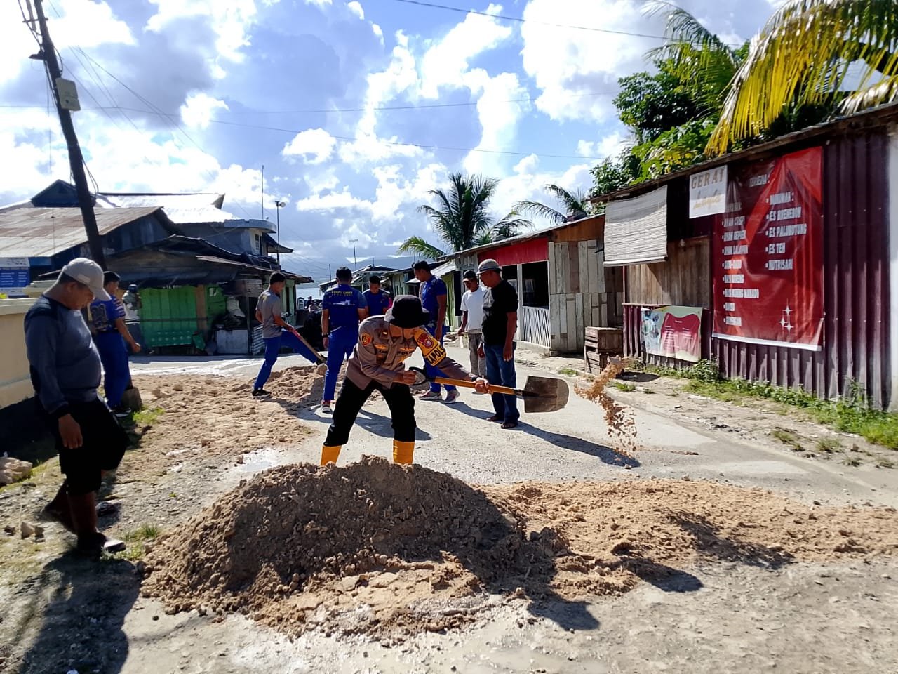 Selanjutnya, personel gabungan melaksanakan perbaikan jalan dengan menimbun lubang-lubang pada badan jalan menggunakan material seadanya, termasuk batu kerikil pantai, pada sejumlah titik jalan yang mengalami kerusakan cukup parah.