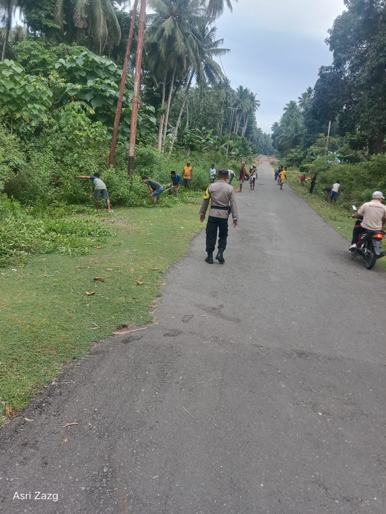 Kegiatan tersebut difokuskan pada pembersihan sepanjang jalan utama Desa Waigai, dengan melakukan pemangkasan rumput serta pemotongan dahan-dahan pohon yang mengganggu pandangan di tepi jalan. Suasana gotong royong tampak penuh semangat dan kebersamaan antara aparat kepolisian, perangkat desa, Linmas, serta warga setempat.