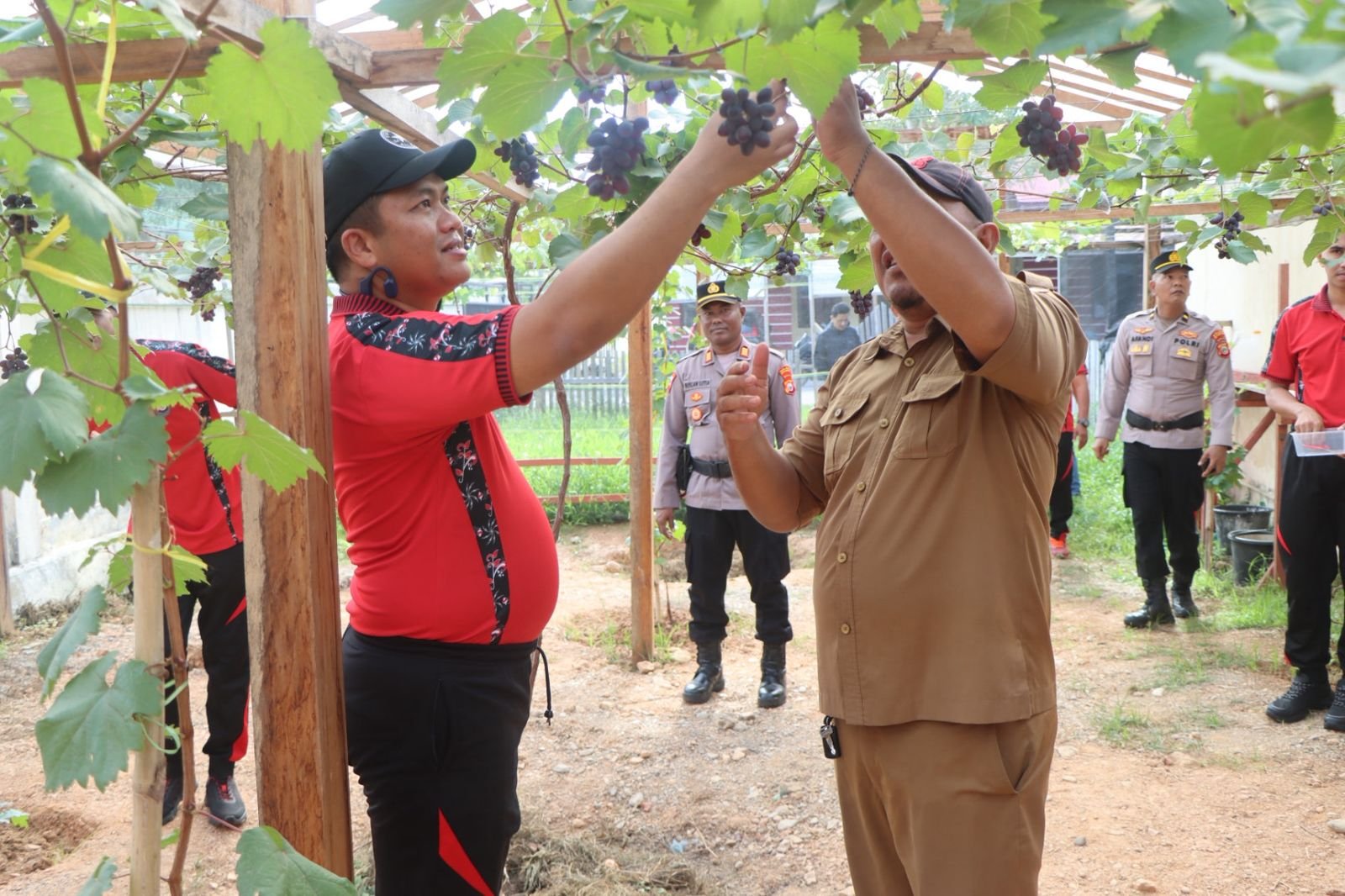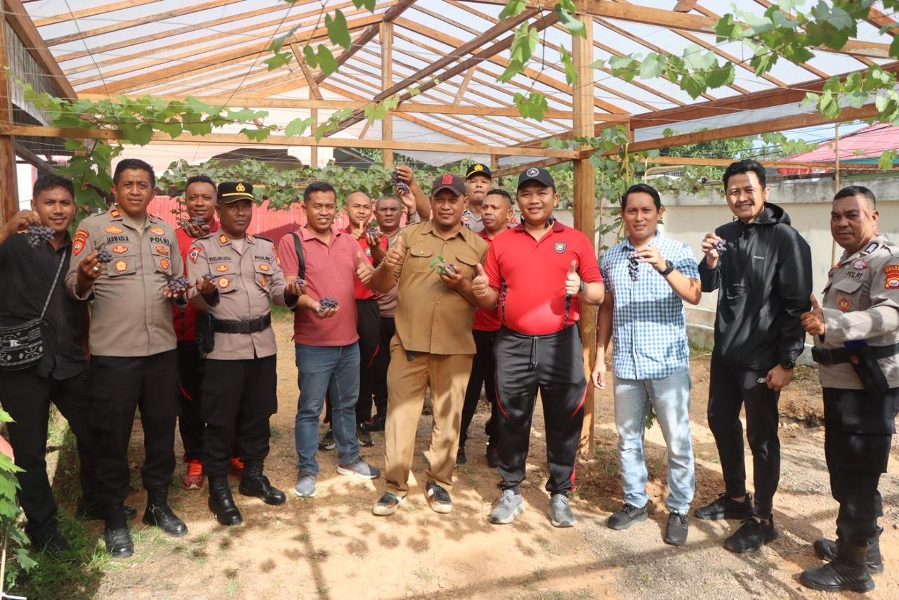 HUMAS POLRES SULA — Pejabat Utama (PJU) Polres Kepulauan Sula menghadiri kegiatan panen buah anggur tahap kedua yang dipimpin langsung oleh Kapolres Kepulauan Sula Kegiatan panen berlangsung di lokasi budidaya anggur yang berada di kompleks Polres, yang selama ini dikembangkan sebagai lahan produktif untuk mendorong kreativitas serta ketahanan pangan di lingkungan Polres.