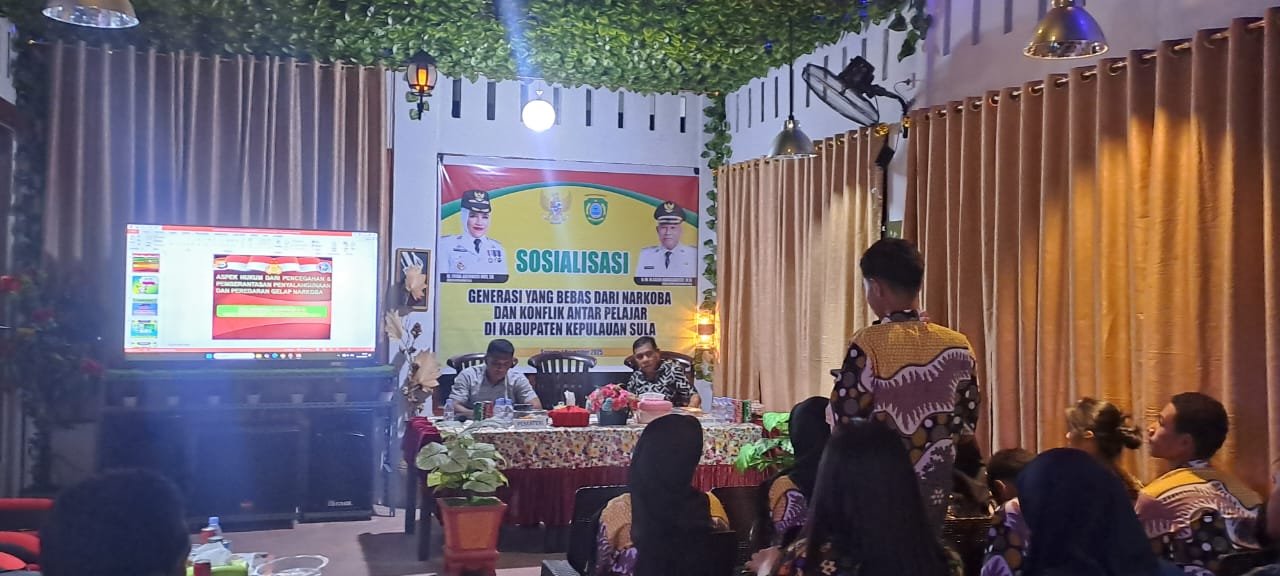 Humas Polres Sula— Dalam upaya mencegah penyalahgunaan narkoba dan konflik sosial di kalangan pelajar, Pemerintah Kabupaten Kepulauan Sula melalui Dinas Kesbangpol bekerja sama dengan Tim Edukasi Polres Kepulauan Sula menggelar kegiatan Sosialisasi Generasi Bebas dari Narkoba dan Konflik Sosial Antar Pelajar, pada Sabtu malam (1/11) pukul 21.00 WIT, bertempat di Soya Love Café, Desa Umaloya, Kecamatan Sanana.