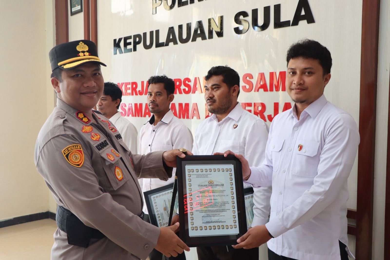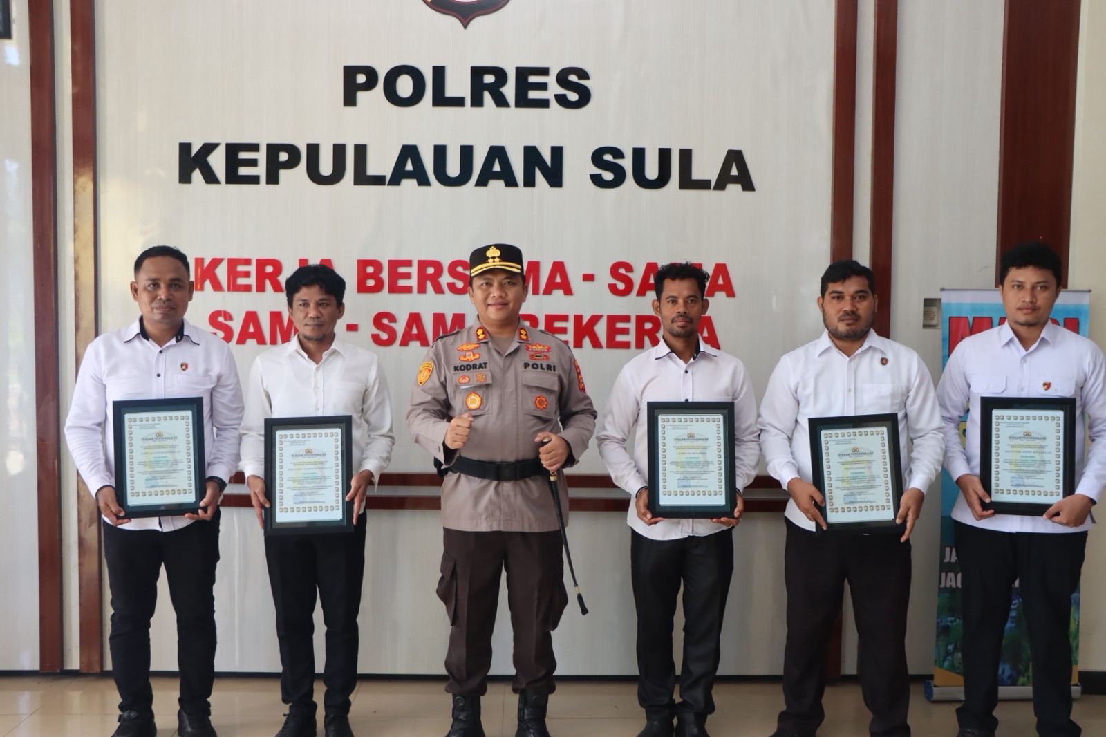 HUMAS POLRES SULA — Kepala Kepolisian Resor Kepulauan Sula memberikan piagam penghargaan kepada lima personel Sentra Penegakan Hukum Terpadu (Gakkumdu) atas prestasi dan dedikasi dalam pelaksanaan tugas kepolisian. Kegiatan tersebut dilaksanakan pada Senin (15/25).