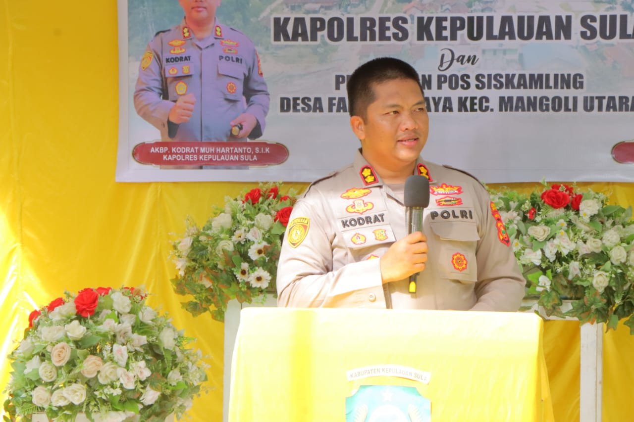Humas Polres Sula — Dalam rangka memperkuat sinergi antara kepolisian dan masyarakat dalam menjaga keamanan dan ketertiban, Kapolres Kepulauan Sula AKBP Kodrat Muh Hartanto, S.I.K. melaksanakan kunjungan kerja ke Polsek Mangoli Barat sekaligus meresmikan Pos Siskamling di wilayah tersebut, pada Rabu (29/10).