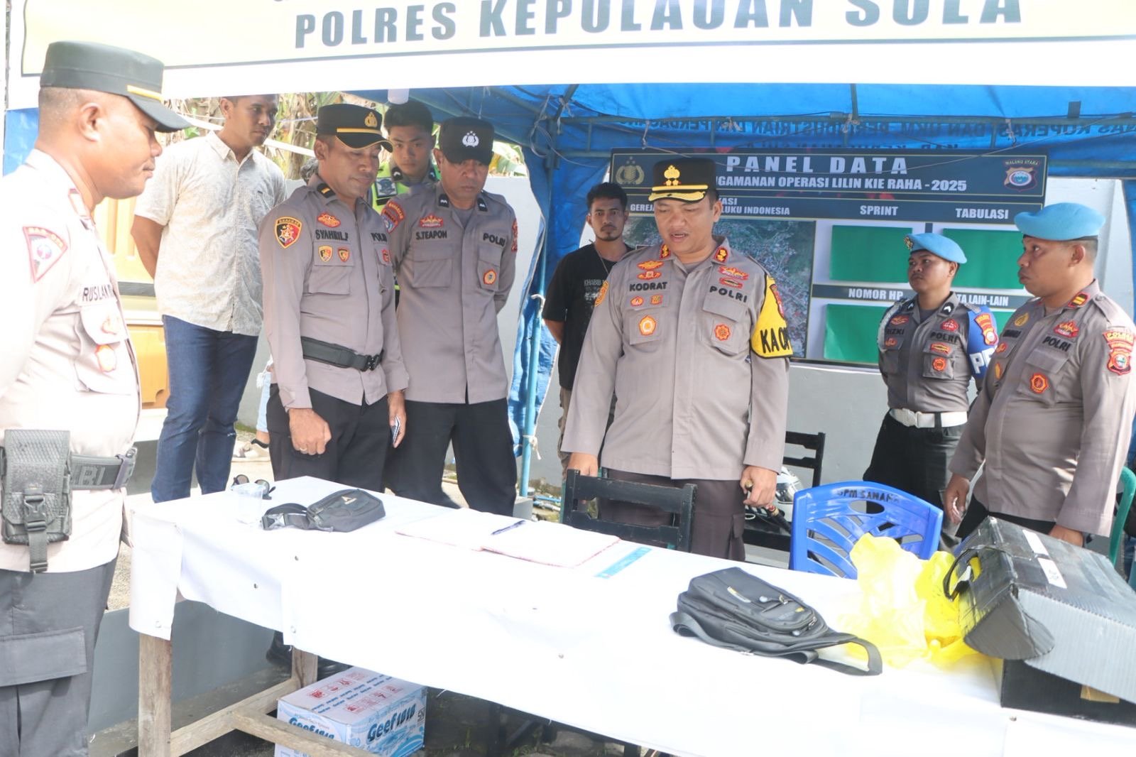 HUMAS POLRES KEPULAUAN SULA — Kapolres Kepulauan Sula, AKBP Kodrat Muh Hartanto, S.I.K., bersama Pejabat Utama Polres Kepulauan Sula meninjau langsung kesiapan personel pengamanan dalam rangka Operasi Lilin Kie Raha pada pengamanan Natal 2025 dan Tahun Baru 2026, Selasa (23/25).