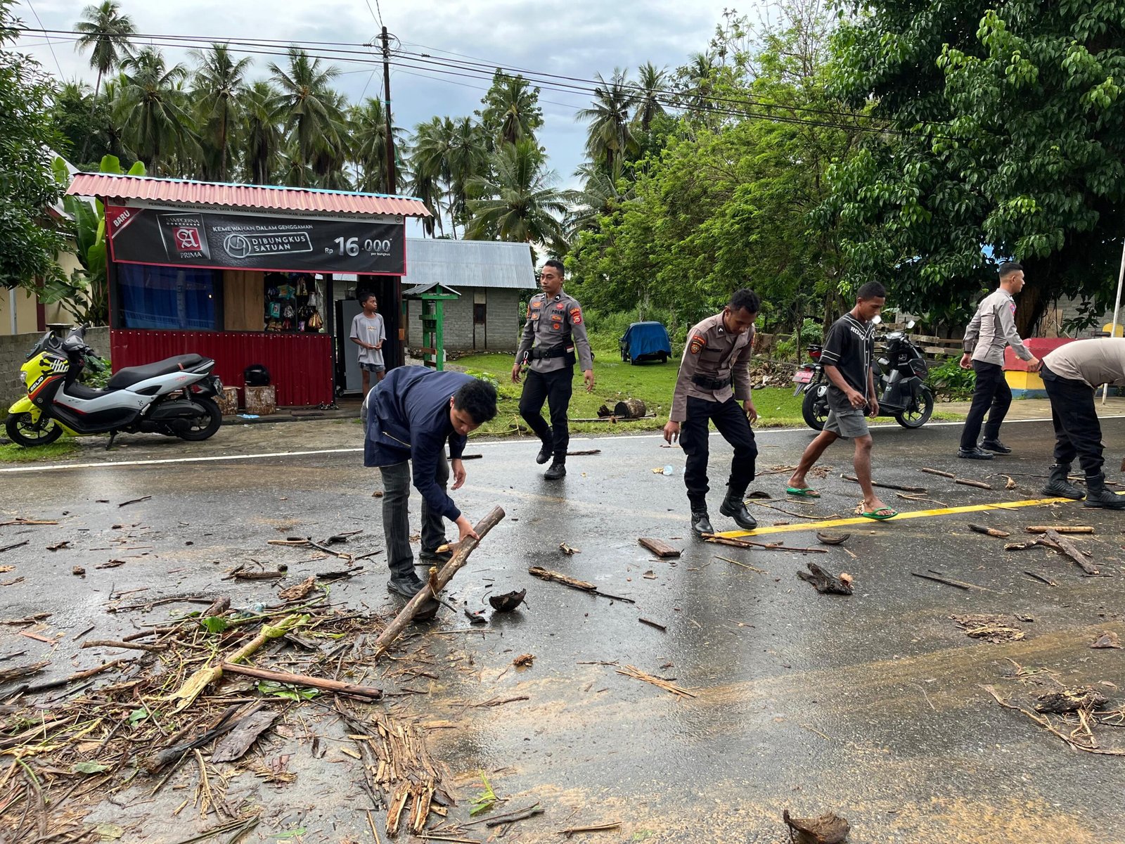 “Akibat hujan deras, air sungai meluap hingga menutupi badan jalan dengan sampah dan material banjir lainnya. Setibanya di lokasi, personel langsung melakukan pembersihan jalan menggunakan peralatan seadanya,” jelas Kapolsek.