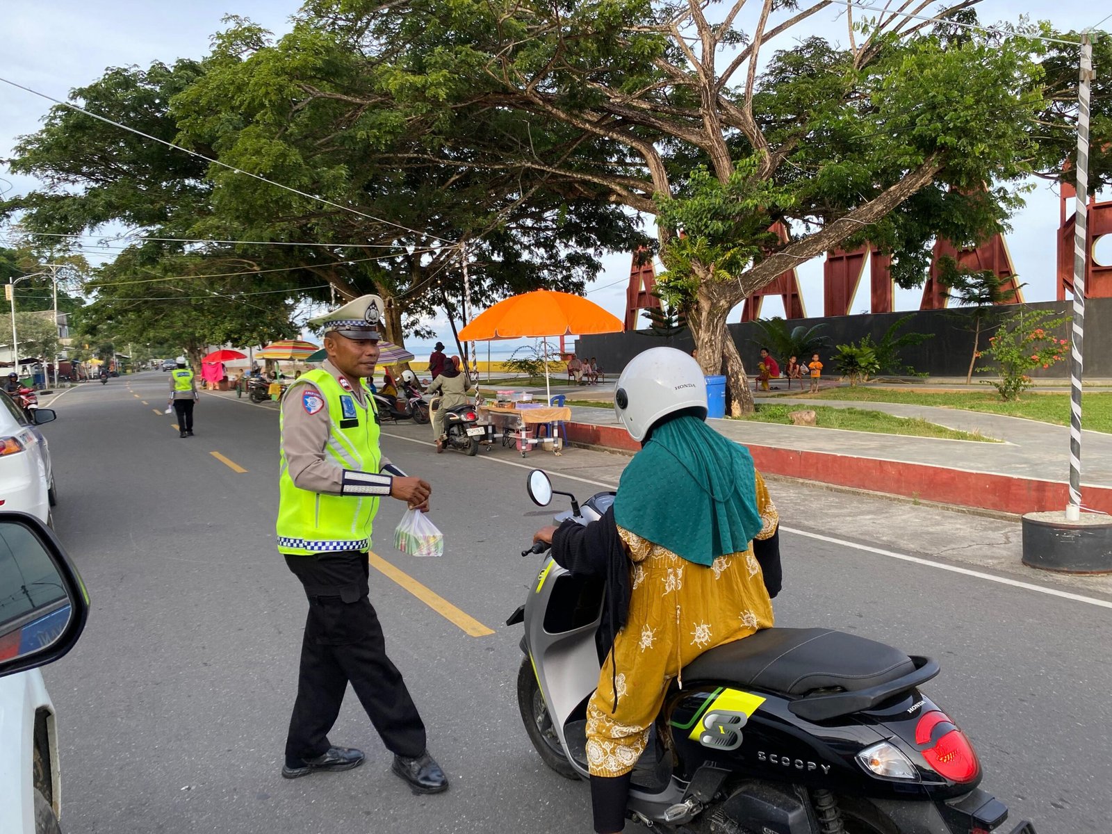 Personel Sat Lantas hadir langsung di tengah masyarakat untuk menyapa sekaligus membagikan takjil kepada pengendara dan warga yang masih beraktivitas menjelang waktu berbuka puasa.