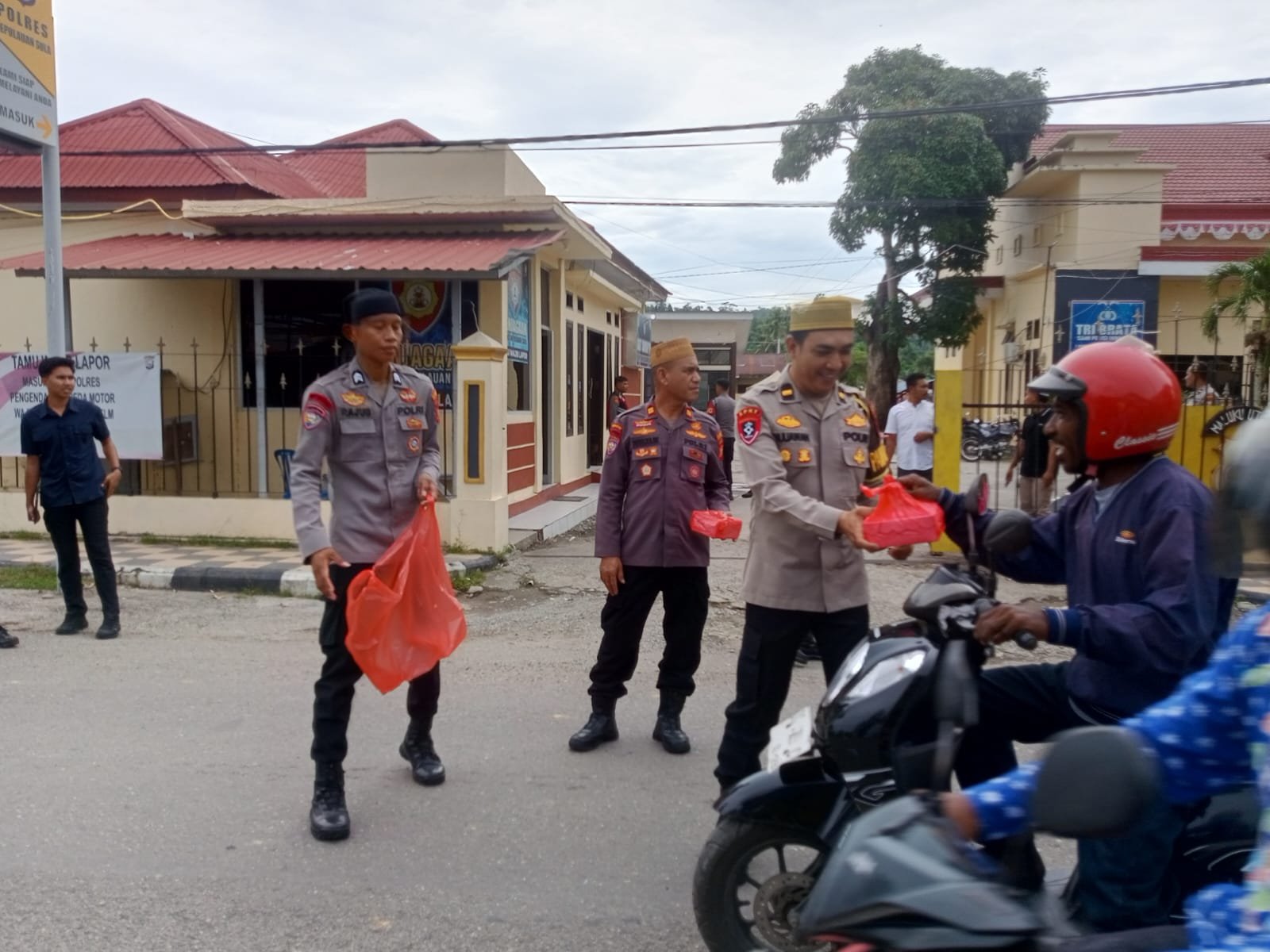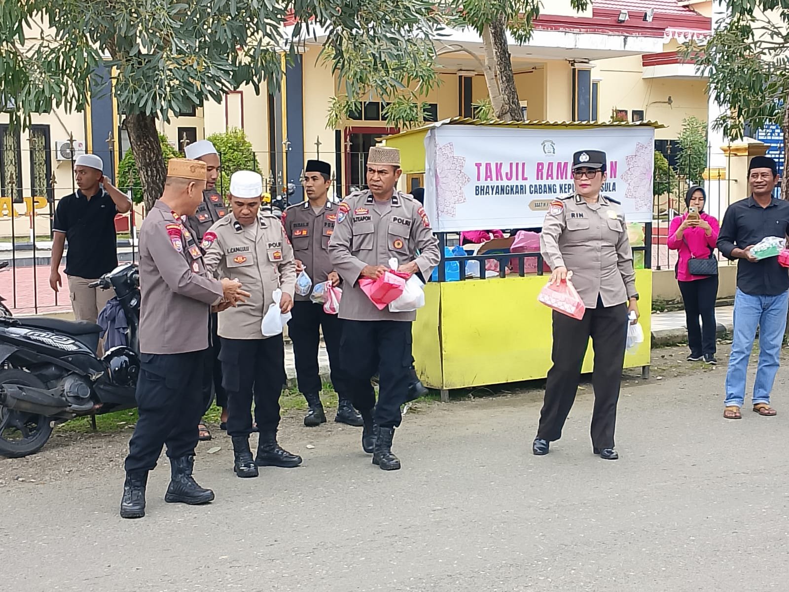 Sebanyak 100 (seratus) kotak takjil dibagikan kepada para pengendara roda dua, roda empat, serta pejalan kaki yang melintas di Jalan Jenderal Besar Soeharto depan Mako Polres Kepulauan Sula.