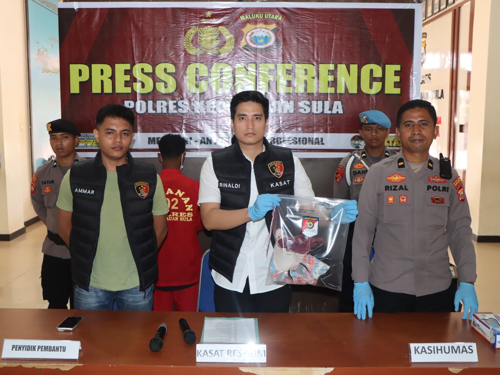 Humas Polres Sula- Kepolisian Resor Sula menggelar konferensi press terkait kasus persetubuhan anak di bawah umur kegiatan berlangsung di Loby Mako Polres Sula.