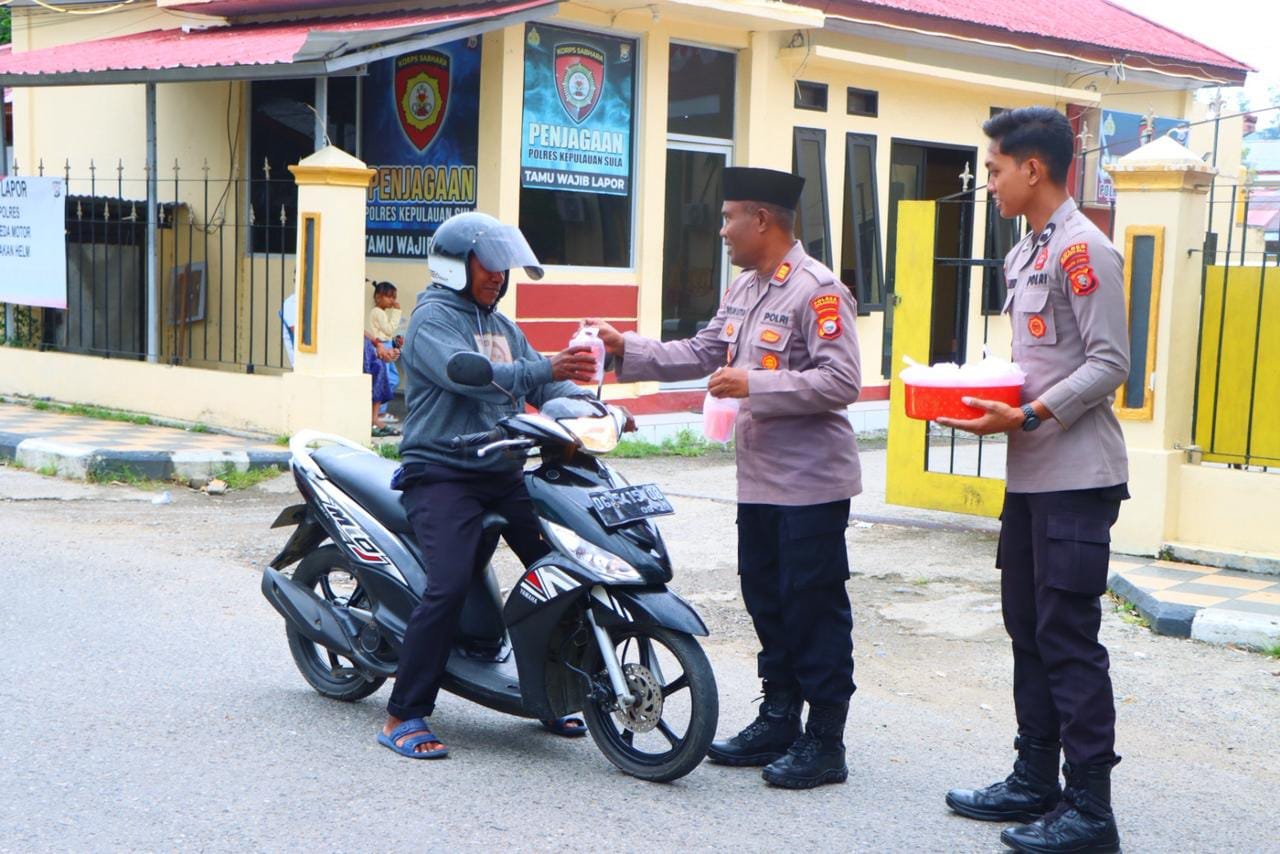 HUMAS POLRES SULA — Dalam rangka menyemarakkan bulan suci Ramadhan 1447 H / 2026 M, Polres Kepulauan Sula melaksanakan kegiatan pembagian takjil kepada masyarakat sebagai bentuk kepedulian dan kebersamaan dengan warga yang menjalankan ibadah puasa.