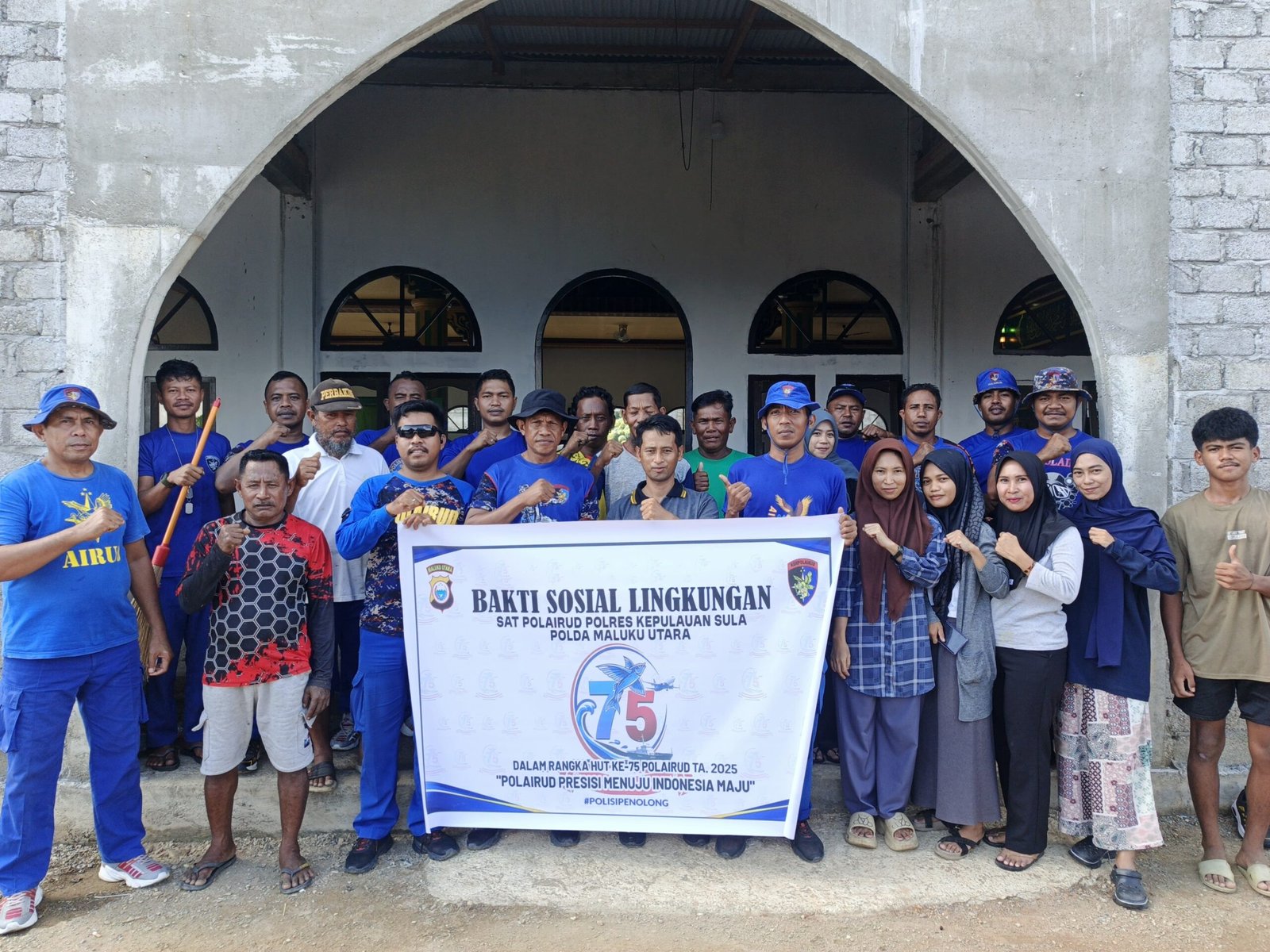 HUMAS POLRES SULA — Dalam rangka memperingati Hari Ulang Tahun Polairud ke-75 dengan moto “Polairud Presisi Menuju Indonesia Maju”, personel Satuan Polairud Polres Kepulauan Sula melaksanakan kegiatan bakti sosial lingkungan di Masjid Hablun Minallah, Desa Bajo, Kecamatan Sanana Utara, Jumat (14/11).