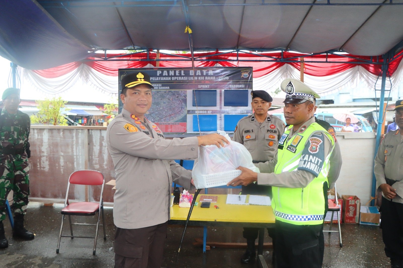 Rangkaian kegiatan diawali pada pukul 09.20 WIT dengan peninjauan Pos Pelayanan Pasar Basanohi, Desa Fogi, Kecamatan Sanana. Pada kesempatan tersebut, Wakil Bupati dan Kapolres menyerahkan paket bingkisan sebagai bentuk apresiasi dan dukungan moril kepada personel pengamanan Operasi Lilin 2025.