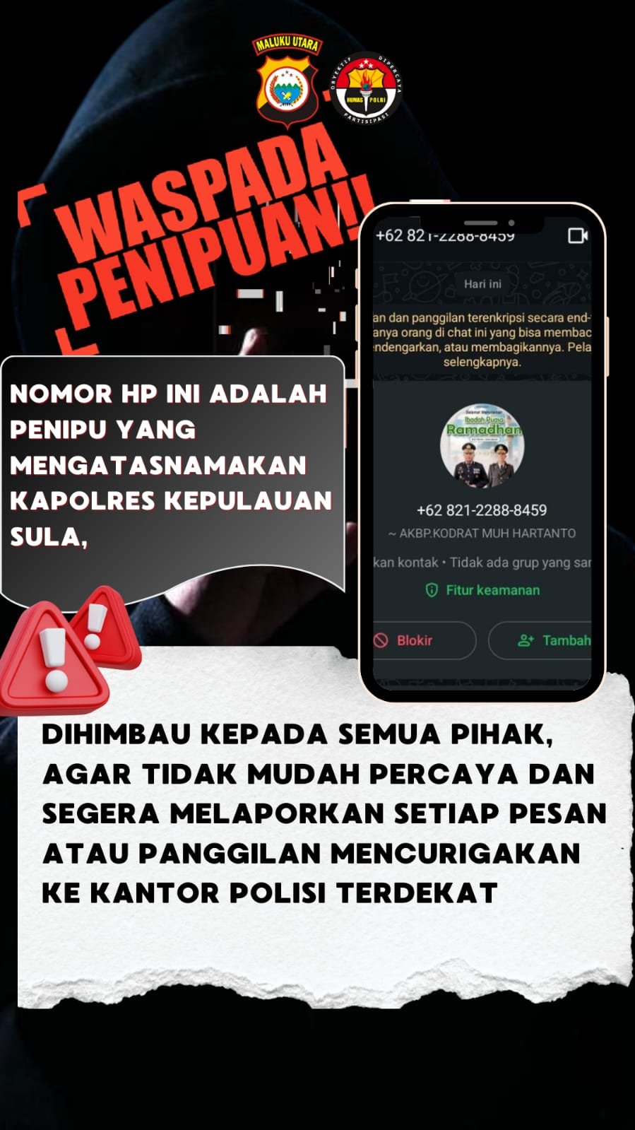 HUMAS POLRES SULA — Masyarakat Kabupaten Kepulauan Sula diimbau untuk meningkatkan kewaspadaan terhadap modus penipuan yang mengatasnamakan pejabat di lingkungan Polres Kepulauan Sula.