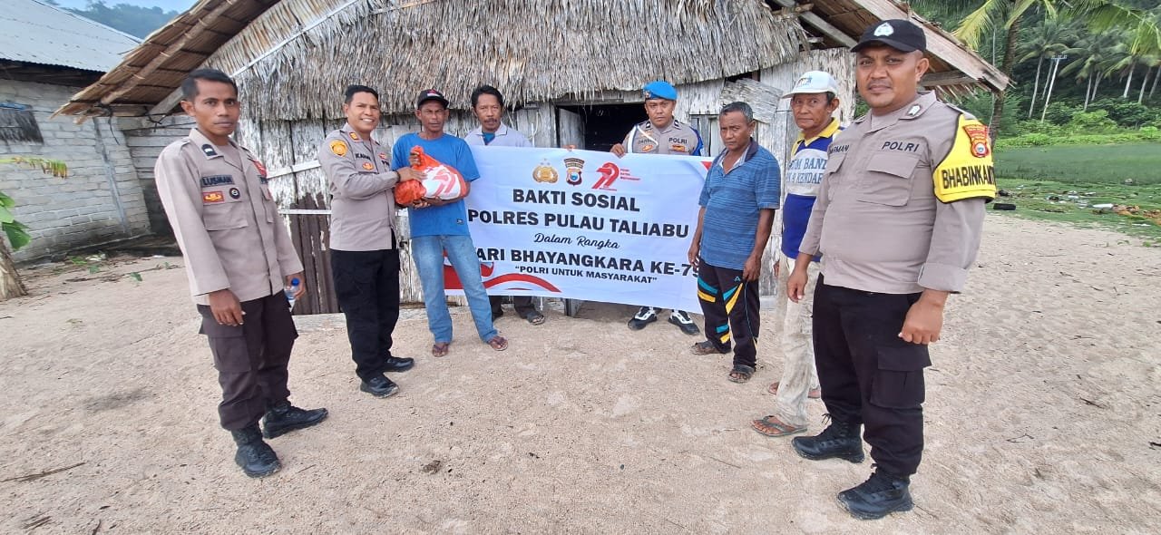 Polsek Taliabu Barat Polres Pulau kembali membagikan bantuan sosial (bansos) berupa paket sembako kepada warga kurang mampu yang ada di wilayah hukumnya menyambut Hari Bhayangkara Ke-79 Tahun 2025.