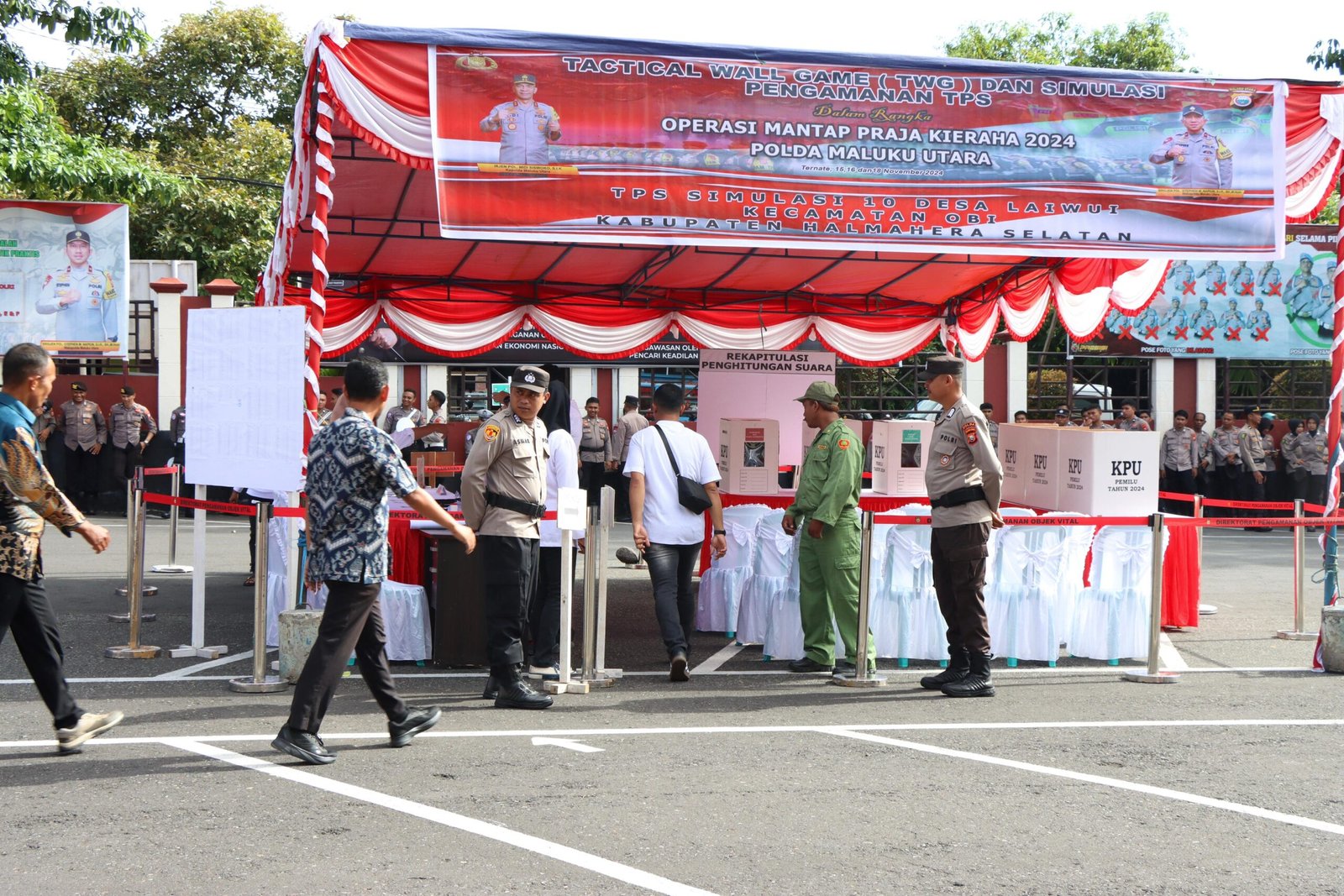 Wakapolda Maluku Utara, Brigjen Pol. Stephen M. Napiun, S.I.K., S.H., M.Hum., menghadiri Tactical Wall Game (TWG) dan simulasi pengamanan Tempat Pemungutan Suara (TPS) dalam rangka Operasi Mantap Praja Kieraha 2024, pada Senin (18/11/2024).