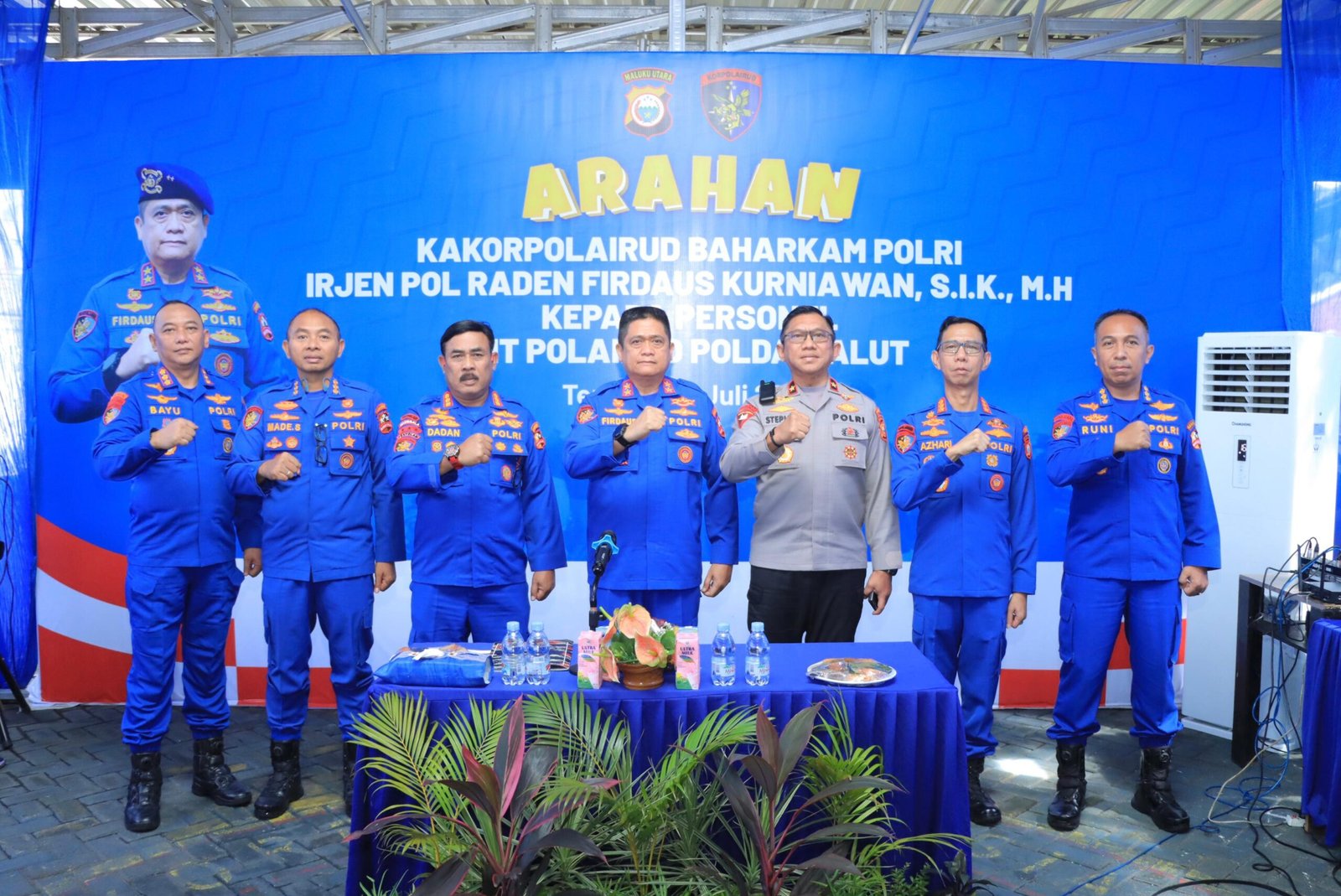 Irjen Pol Firdaus datang bersama rombongan pejabat Baharkam Polri dan disambut langsung oleh Wakapolda Maluku Utara, Brigjen Pol. Stephen M. Napiun, S.I.K., S.H., M.Hum., dan Direktur Polairud Polda Malut, Kombes Pol. Azhari Juanda, S.I.K., beserta jajaran personel Ditpolairud.