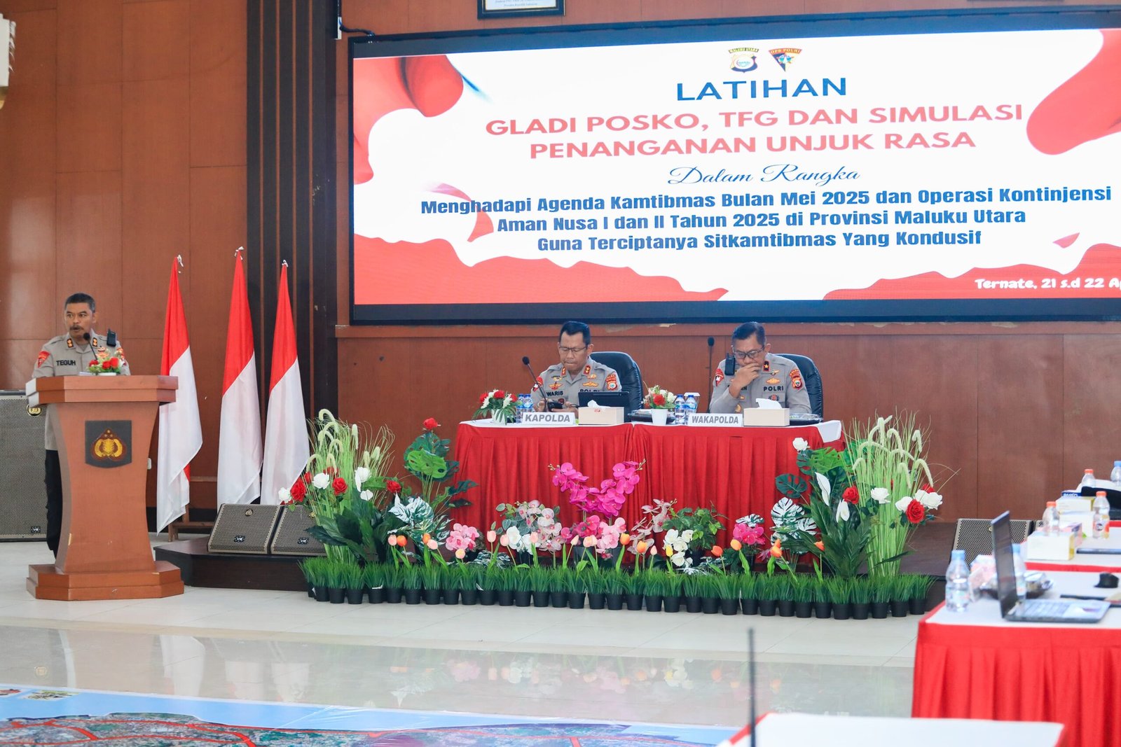 Kapolda Maluku Utara secara resmi membuka kegiatan Pelatihan Gladi Posko, Tactical Floor Game (TFG), dan Simulasi Penanganan Unjuk Rasa (Unras) yang dilaksanakan di Aula Polda Maluku Utara.