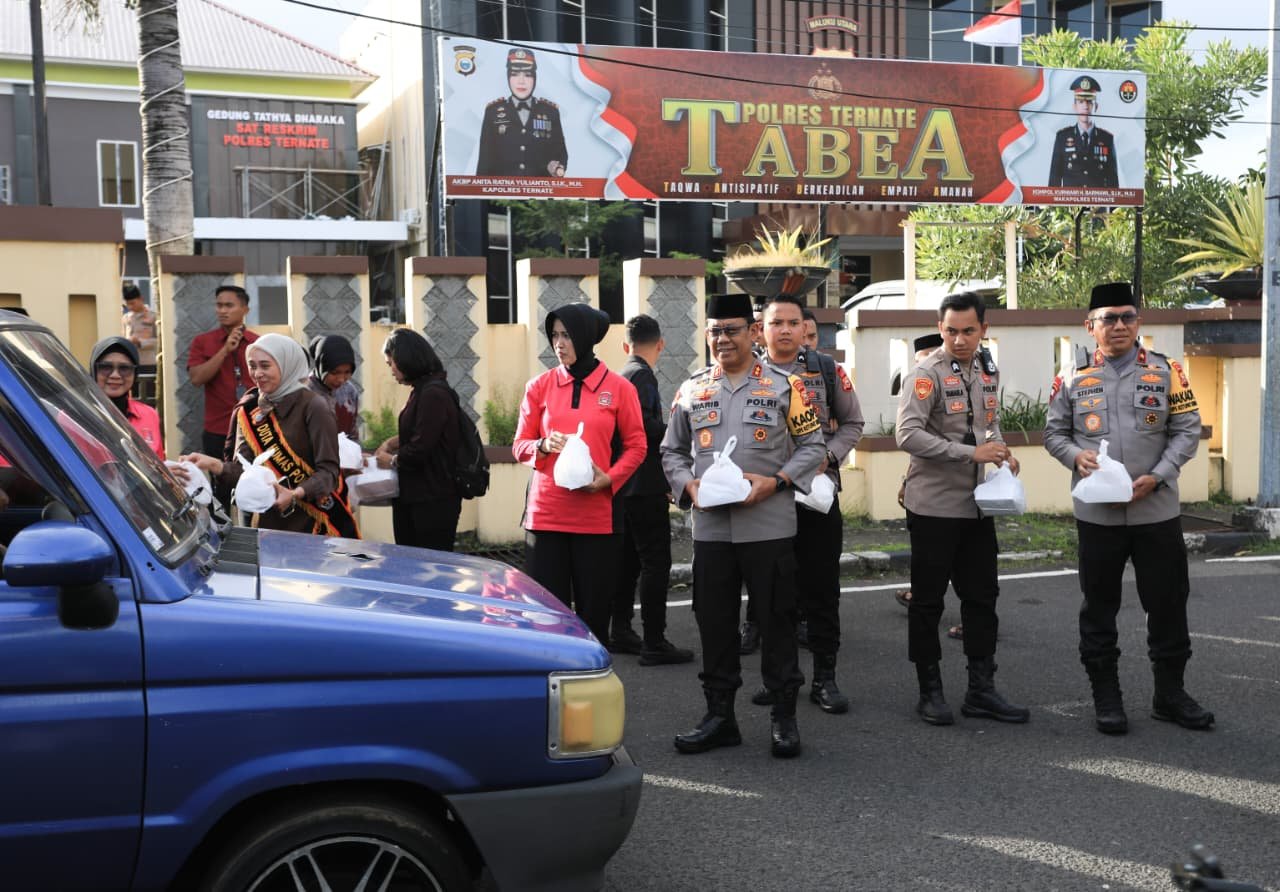 Momentum bulan suci Ramadan dimanfaatkan jajaran Kepolisian Daerah Maluku Utara untuk semakin mendekatkan diri dengan masyarakat melalui aksi berbagi. Salah satunya dengan kegiatan pembagian takjil kepada para pengendara dan masyarakat yang melintas di depan Mapolres Ternate, Sabtu (14/3).
