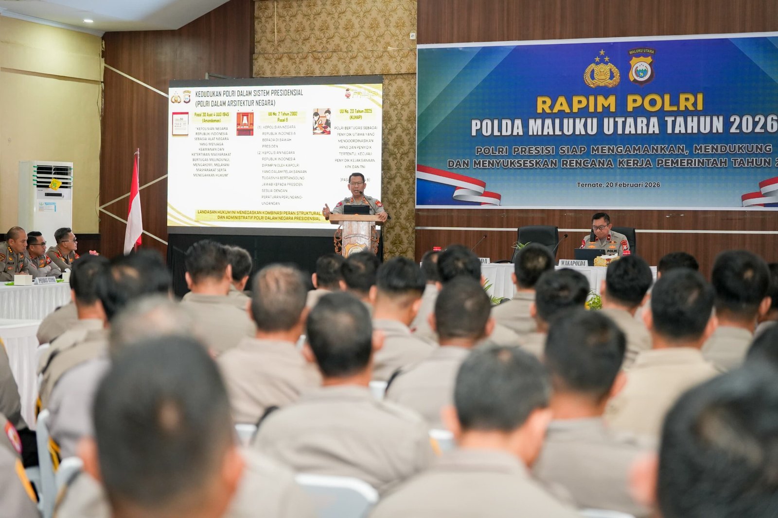 HUMAS POLDA MALUT – Kapolda Maluku Utara Irjen Pol. Drs. Waris Agono, M.Si., membuka Rapat Pimpinan (Rapim) Polri Tingkat Polda Maluku Utara Tahun 2026 pada Jumat (20/2/2026). Kegiatan tersebut berlangsung di Aula Polres Ternate dan diikuti seluruh jajaran Polda Malut.