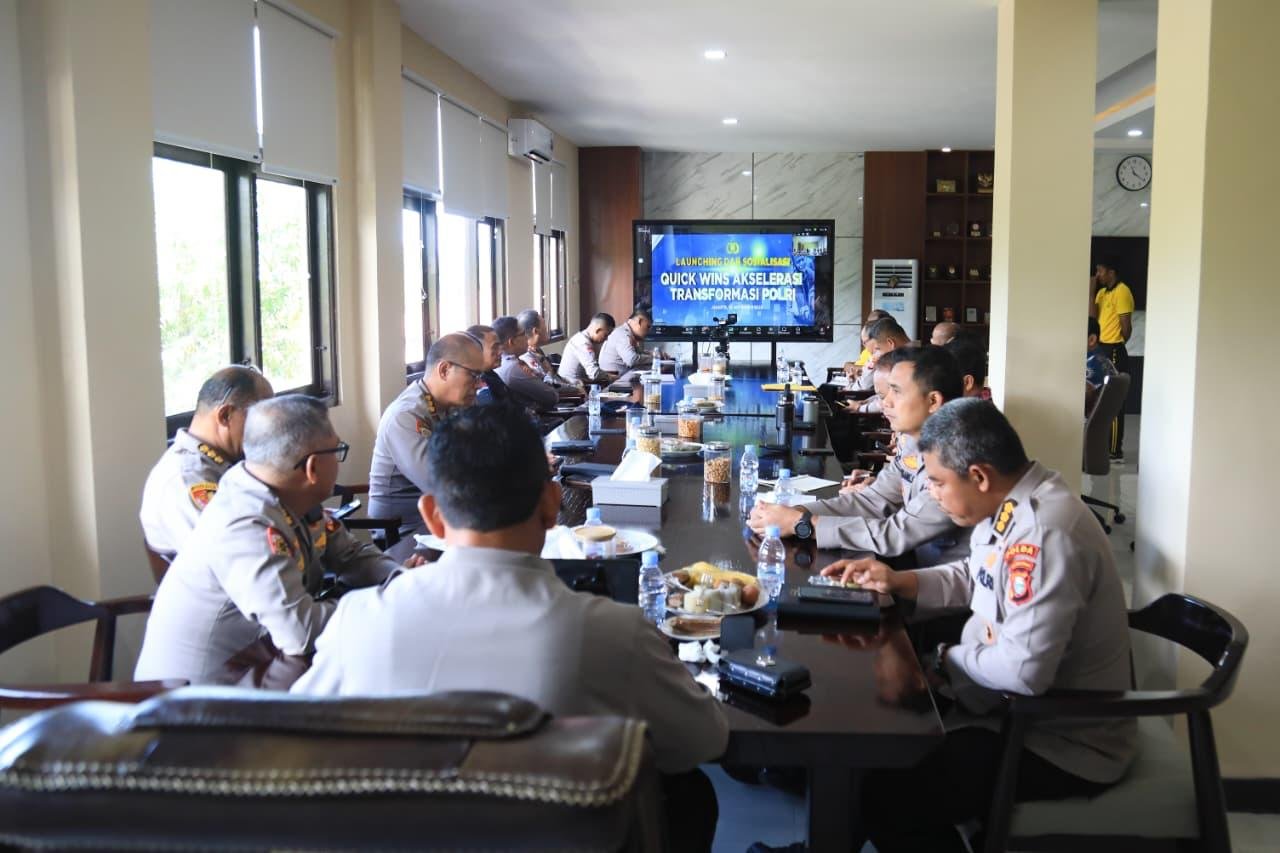 HUMAS POLDA MALUT – Kapolda Maluku Utara Irjen Pol. Drs. Waris Agono, M.Si menghadiri kegiatan launching dan sosialisasi Quick Wins Akselerasi Transformasi Polri yang dipimpin Wakapolri Komjen Pol. Prof. Dr. Dedi Prasetyo, S.H., M.Hum., M.Si., M.M., melalui zoom meeting, Jumat (26/9/2025). Kegiatan tersebut berlangsung di ruang kerja Kapolda.