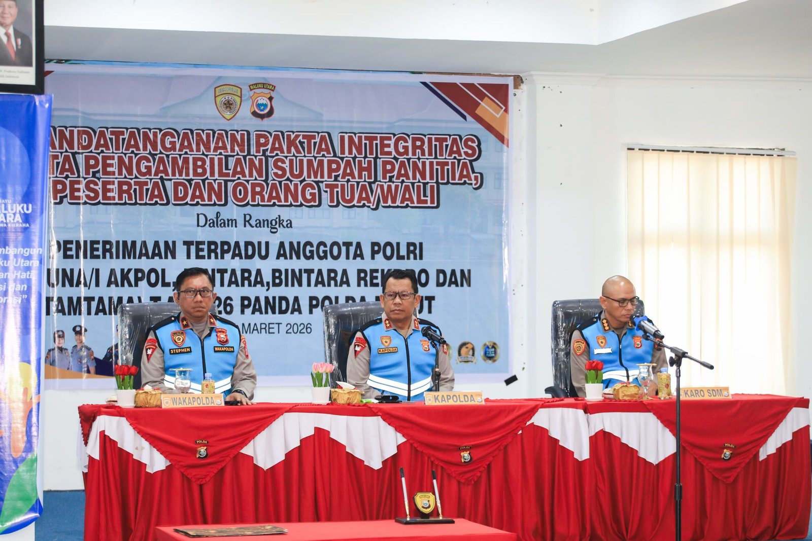 HUMAS POLDA MALUT – Kapolda Maluku Utara Irjen Pol. Drs. Waris Agono, M.Si., memimpin kegiatan penandatanganan pakta integritas serta pengambilan sumpah panitia dan peserta dalam Penerimaan Terpadu Anggota Polri Tahun Anggaran 2026 Panda Polda Malut. berlangsung pada Selasa (31/3/2026) di Aula Kantor Dinas Pendidikan dan Kebudayaan Provinsi Maluku Utara.