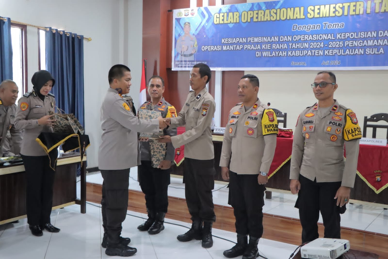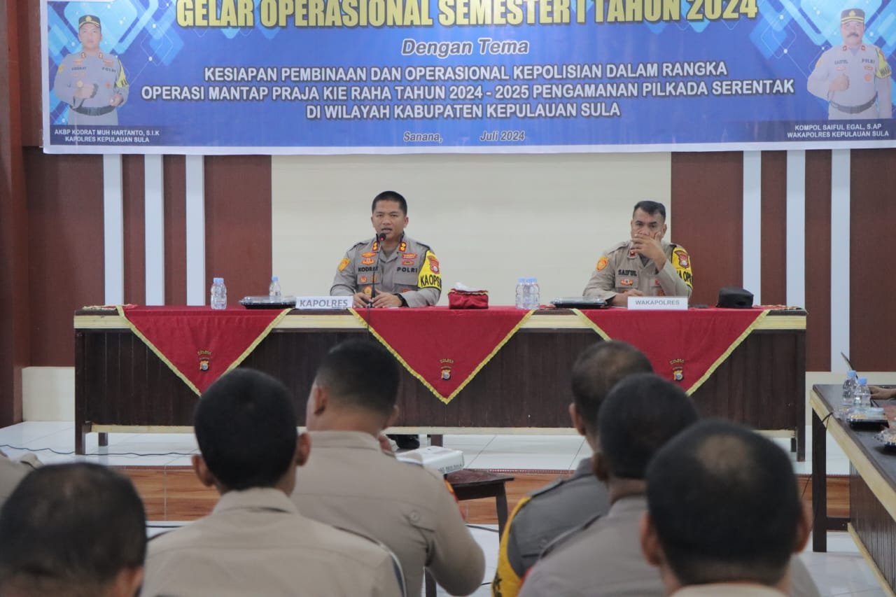 Polres Kepulauan Sula- Kepolisian Resor Sula menggelar Operasional Semester I Tahun 2024 di Aula Polres, pada Jumat (19/7/24). Kegiatan ini bertemakan “Kesiapan Pembinaan dan Operasional Kepolisian dalam Rangka Operasi Mantap Praja Kie Raha Tahun 2024-2025”, dengan fokus pada pengamanan Pilkada serentak di Wilayah Kabupaten Kepulauan Sula.