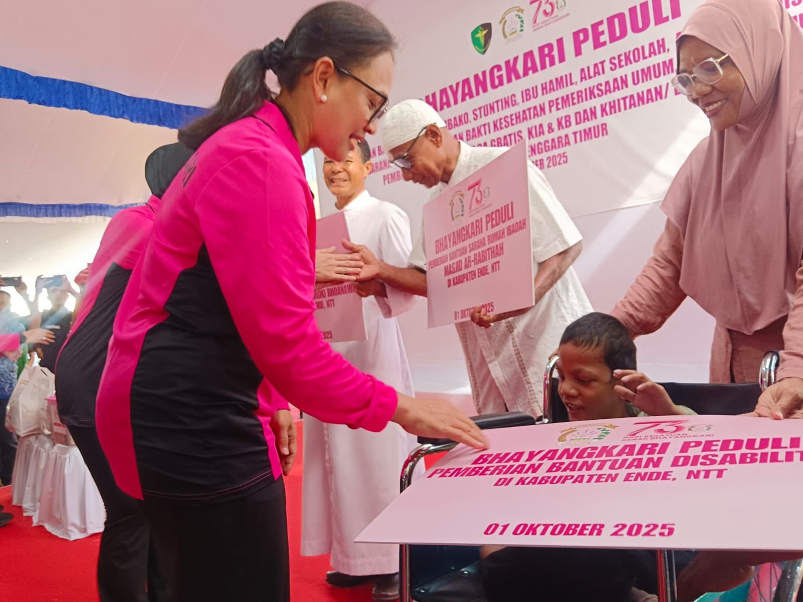 Ende, NTT – Ketua Umum Bhayangkari, Ny. Julianti Sigit Prabowo, melaksanakan rangkaian kegiatan Bhayangkari Peduli di Kabupaten Ende, Nusa Tenggara Timur, Rabu (1/10/2025). Kegiatan ini meliputi penyaluran bantuan sosial, bakti kesehatan, serta bakti religi yang dipusatkan di halaman Kantor Camat Ende Utara, Kelurahan Kota Raja, Kecamatan Ende Utara.