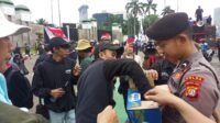 Aksi Simpatik, Polisi Bagikan Air Mineral dan Roti kepada Buruh di Depan DPR/MPR