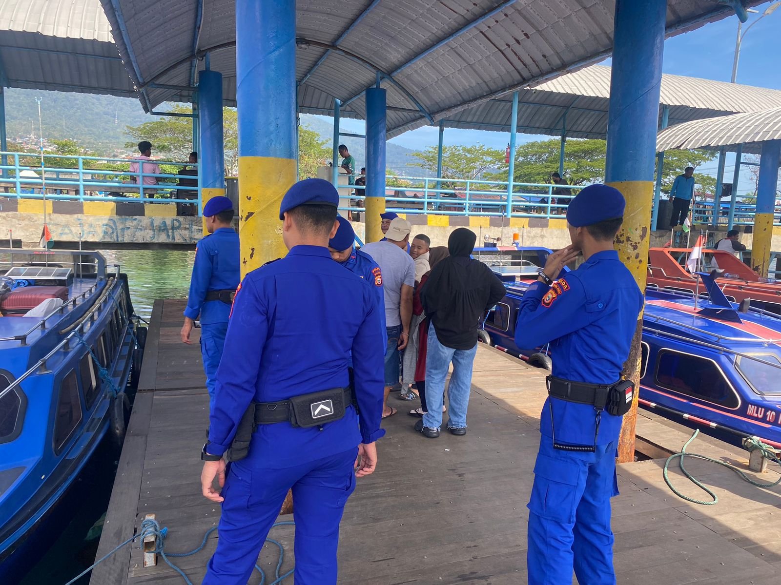 Personel Subsatgas Polairud Operasi Mantap Praja (OMP) Kieraha 2024 melaksanakan patroli keamanan dan ketertiban masyarakat (Kamtibmas) di Pelabuhan Semut dan Pelabuhan Bastiong, Kota Ternate, pada Sabtu (2/11/2024).