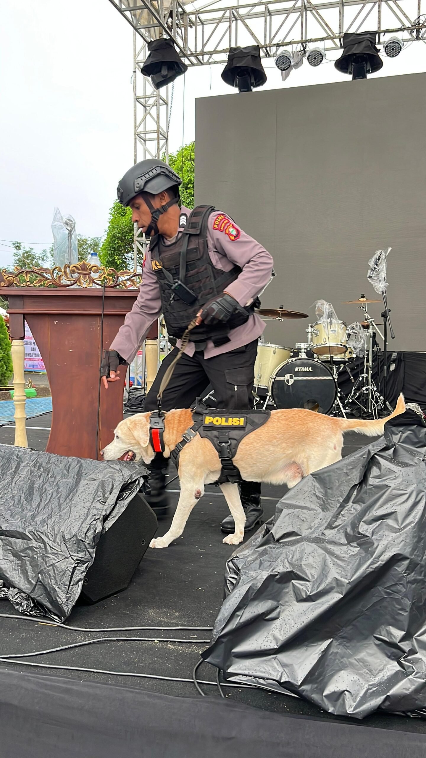 Penyisiran dilakukan secara menyeluruh menggunakan anjing pelacak mulai dari area panggung, ruang kegiatan, hingga fasilitas penunjang, guna memastikan lokasi steril dari benda berbahaya maupun material yang berpotensi mengganggu jalannya acara.