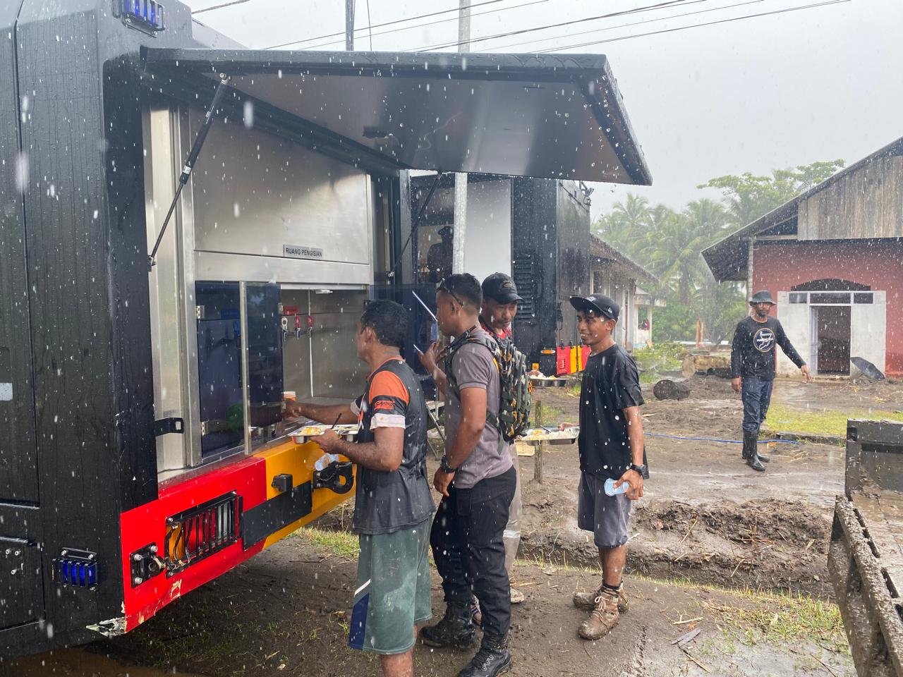 Selain menyiapkan makanan, tim juga mendistribusikan air siap konsumsi hasil penyulingan dari Ransus Water Treatment. Air bersih tersebut disalurkan untuk memenuhi kebutuhan minum warga yang terdampak musibah banjir.