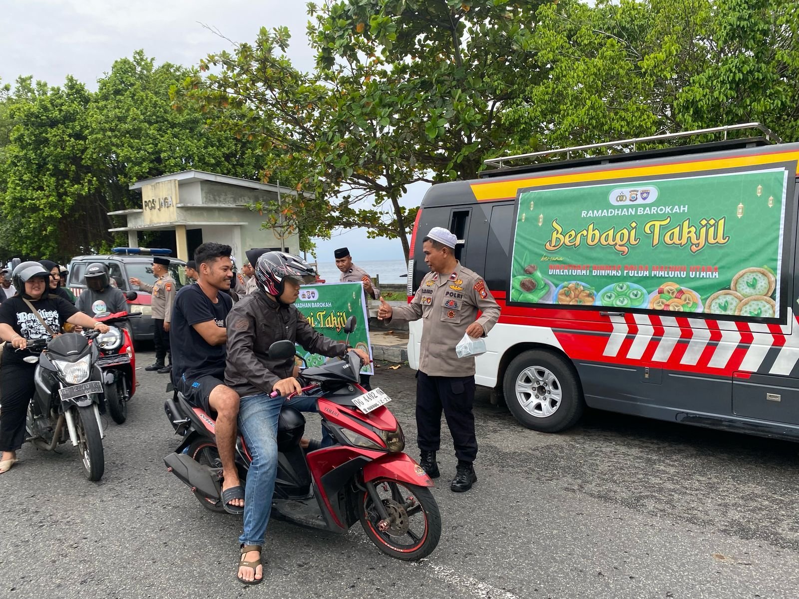 Dalam rangka mempererat hubungan antara Polri dan masyarakat, Direktorat Pembinaan Masyarakat (Ditbinmas) Polda Maluku Utara melaksanakan kegiatan pembagian takjil gratis bagi masyarakat menjelang waktu berbuka puasa, bertempat di Taman Kota Toboko, Kota Ternate. Senin (17/3)