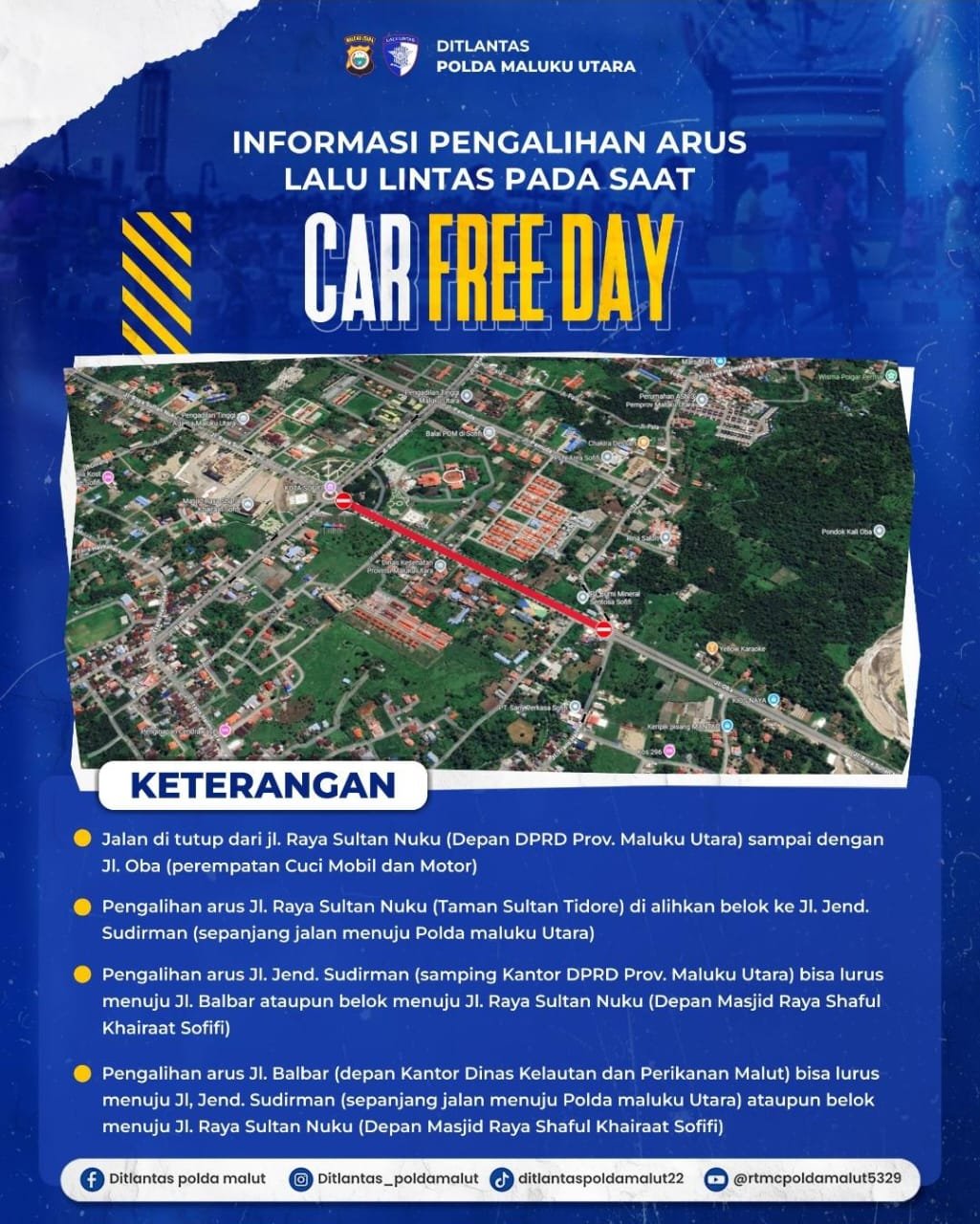 Untuk mendukung kelancaran kegiatan, jajaran Ditlantas Polda Malut telah menyiapkan skema pengalihan arus lalu lintas. Pengalihan akan dilakukan untuk pertama kalinya di rute CFD, yaitu dari Jalan Raya Sultan Nuku (depan DPRD Provinsi Maluku Utara) sampai dengan Jalan Oba (perempatan cuci motor dan mobi). Masyarakatat yang melintas diharapkan mematuhi arahan petugas.
