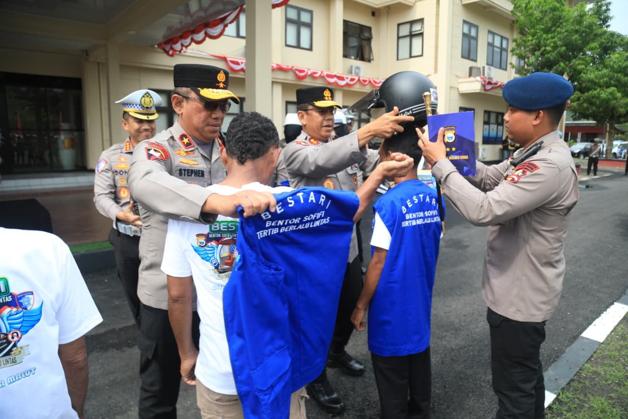 Turut hadir Wakapolda Maluku Utara, Brigjen Pol. Stephen M. Napiun, SIK, SH, M.Hum., Irwasda Polda Malut, Kombes Pol. Andrie Rondonuwu, SIK, M.Si., beserta seluruh Pejabat Utama Polda Malut dan kelompok Bestari (Bentor Sofifi Tertib Berlalu Lintas).