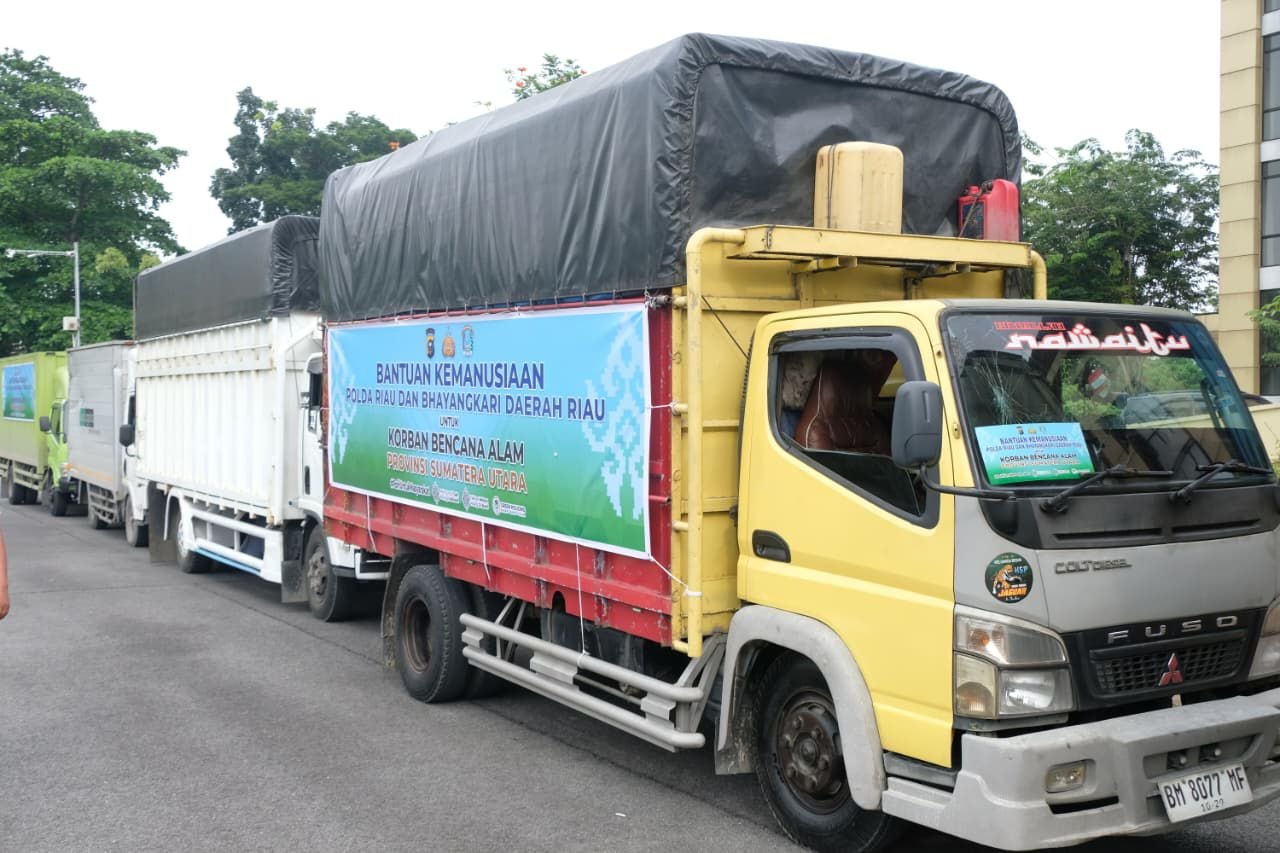 Polda Riau mengerahkan 9 kendaraan, terdiri dari 6 truk logistik (2 truk untuk Aceh, 2 untuk Sumatera Utara, dan 2 untuk Sumatera Barat) serta 3 mobil Patwal Ditlantas dengan pengamanan Brimob dan Propam. Armada ini membawa bantuan pengungsi dalam jumlah besar berupa beras 4 ton, mie instan 900 dus, Pop Mie 300 dus, sarden 120 dus, air mineral 420 dus, kue kaleng 420 dus, biskuit 300 dus, susu kental manis 120 dus, gula 120 dus, teh 60 pax, kopi 60 pax, selimut 1.450 pcs, susu bayi 120 dus, pampers 180 pcs, pembalut wanita 180 pcs, kontainer box 150 unit, serta pakaian layak pakai 68 koli. Bantuan ini merupakan hasil sinergi Polda Riau dan Bhayangkari sebagai wujud respon cepat atas kebutuhan warga.