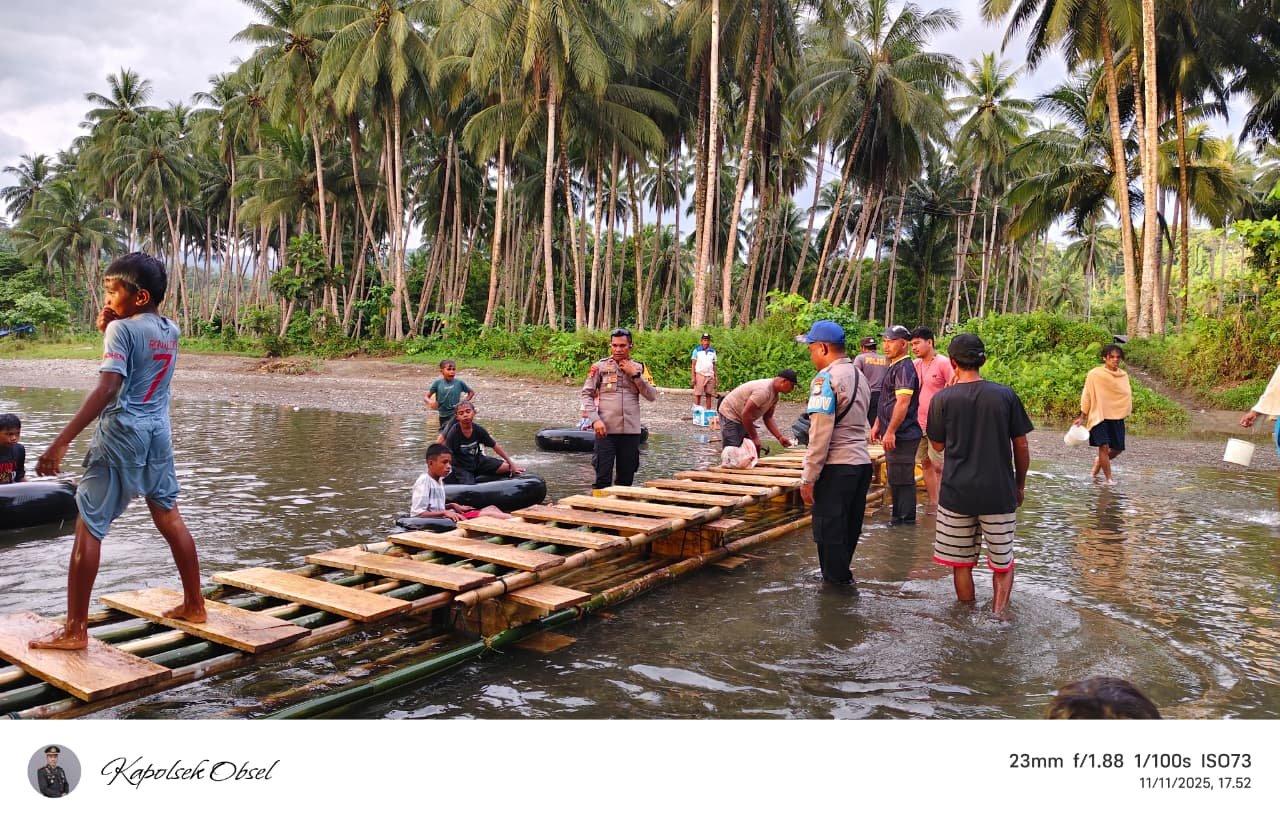 HUMAS POLDA MALUT – Personel Polsek Obi Selatan, Polres Halmahera Selatan, menggelar aksi kemanusiaan dengan membuat rakit di Sungai Gosora, Desa Bobo, Kecamatan Obi Selatan, Selasa (11/11/2025). Rakit tersebut dibuat untuk membantu warga menyeberangi sungai yang setiap hari menjadi jalur utama aktivitas masyarakat.
