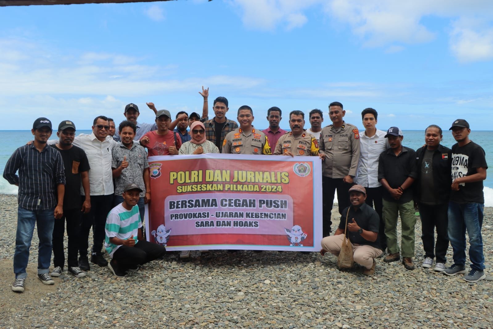 Polres Kepulauan Sula- Kepolisian Resor Sula Menggelar Deklarasi Pilkada Damai Bersama Jurnalis Ajak Sukseskan Pilkada 2024, yang dilaksanakan di Pantai Desa Waipa, Senin (19/8/24).