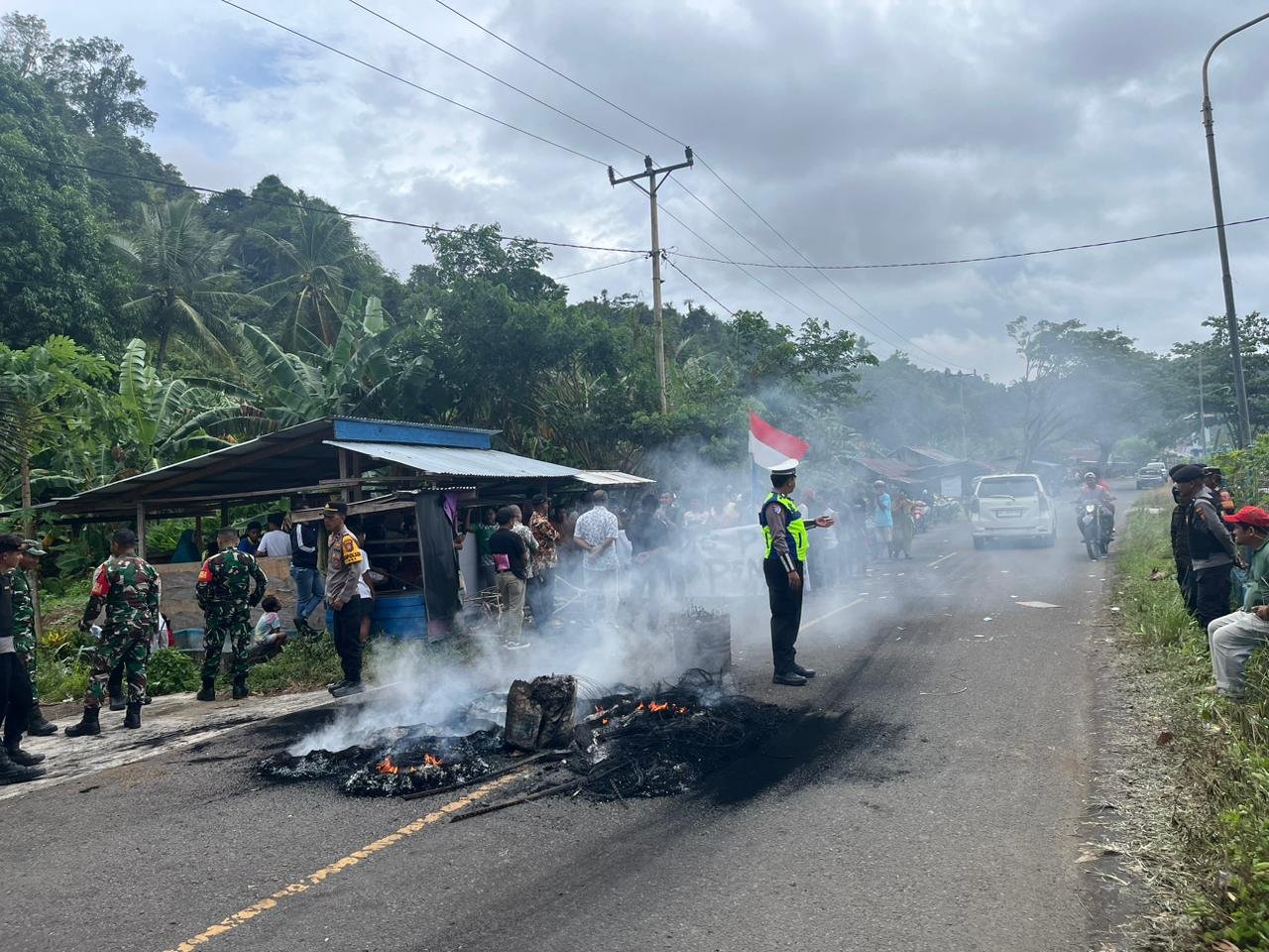 Puluhan Personel Polresta Tidore mengamankan jalannya aksi unjuk rasa yang dilakukan oleh warga yang menuntut pencopotan Kepala Desa Gita Raja yang berlangsung di depan Kantor Desa Gita Raja, Kota Tidore Kepulauan, Kamis (12/2) kemarin.