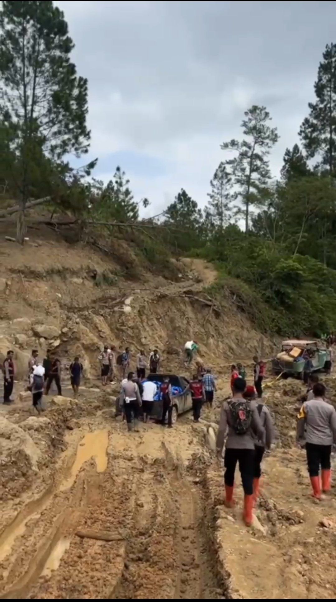 Perjalanan menuju Kecamatan Pining dihadapkan pada berbagai kendala, mulai dari jalan licin, lumpur tebal, hingga material banjir yang menutup hampir seluruh jalur. Di sejumlah titik, rombongan harus berhenti dan menunggu alat berat membuka jalan. Kapolres bersama unsur pemerintah daerah secara langsung mengawal proses pembukaan akses agar jalur dapat segera dilalui.