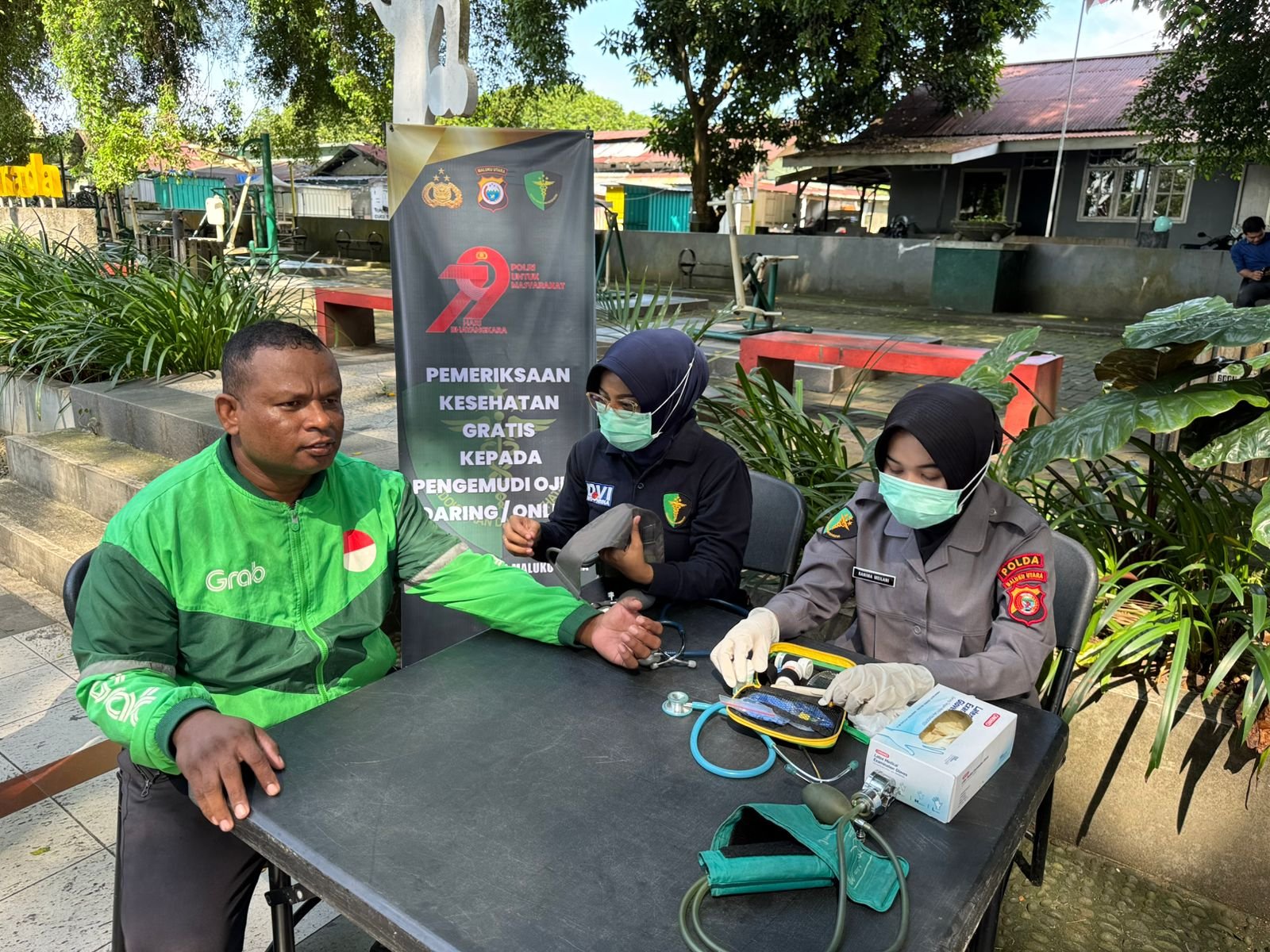 Menyambut Hari Bhayangkara ke-79, Polda Maluku Utara melalui Bid Dokkes Polda Malut menggelar kegiatan pelayanan kesehatan gratis bagi para pengemudi ojek dan pekerja informal di sejumlah lokasi di Kota Ternate, Rabu (11/6).