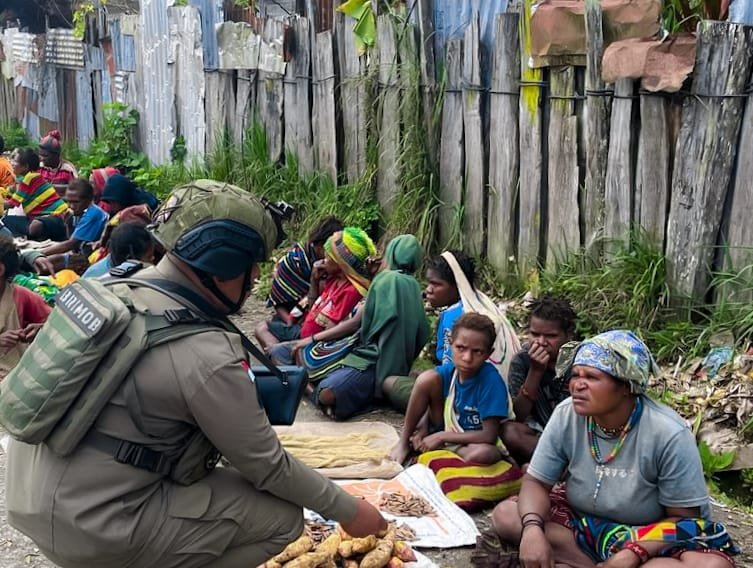 *Intan Jaya—* Satgas Ops Damai Cartenz-2025 menggelar patroli dialogis dengan menyapa mama-mama Papua penjual bahan pangan lokal di pasar Kabupaten Intan Jaya, Selasa (25/3/2025). Kegiatan ini bertujuan memastikan situasi keamanan dan ketertiban masyarakat (kamtibmas) tetap kondusif.